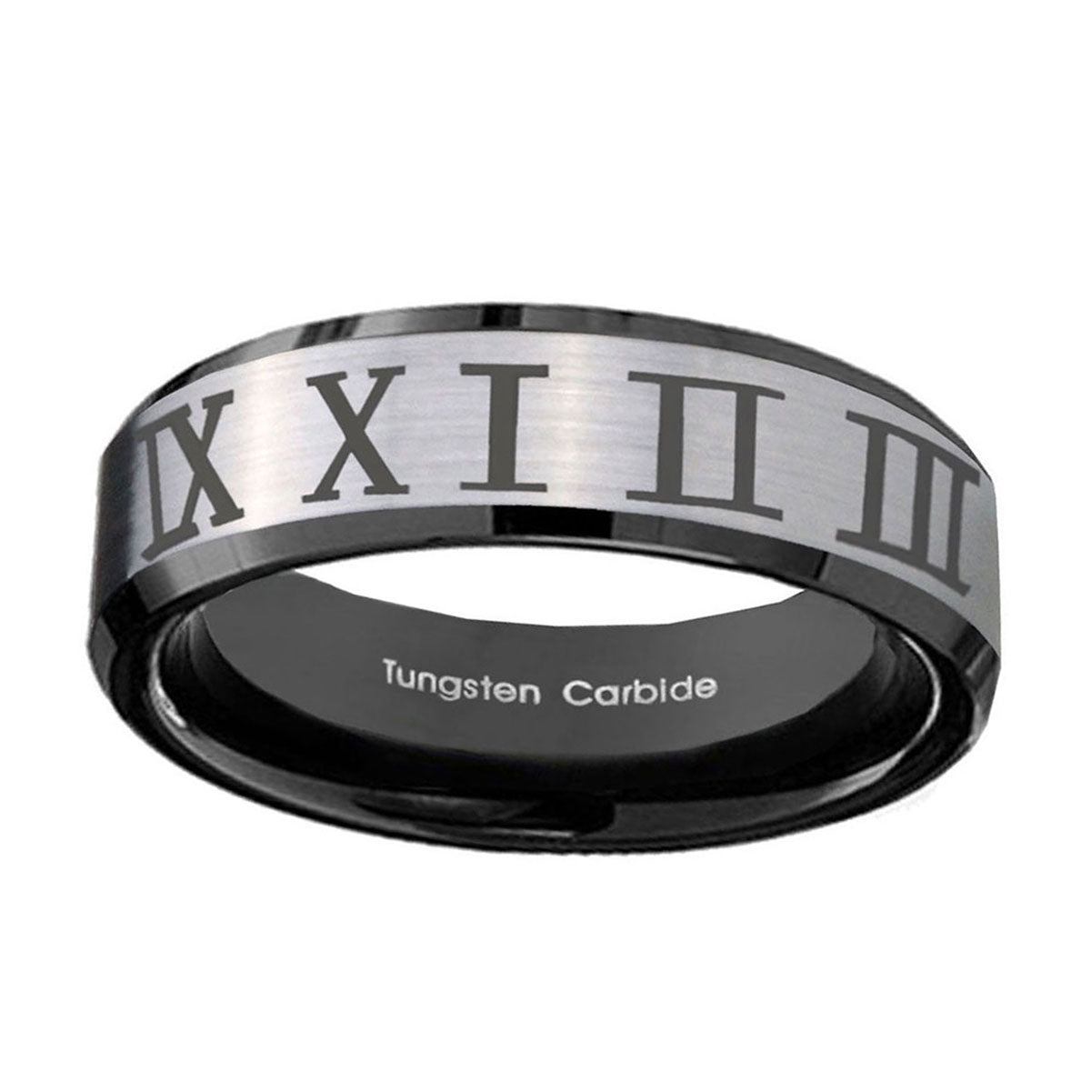 10mm Roman Numeral Beveled Edges Brushed Silver Black Tungsten Engagement Ring