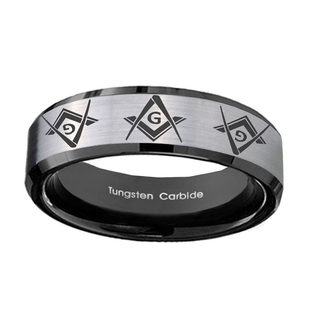 Celebrate with the 10mm Master Mason Masonic Beveled Brushed Silver Black Tungsten Bands Ring. This silver and black tungsten ring with Master Mason Masonic design is perfect for weddings.