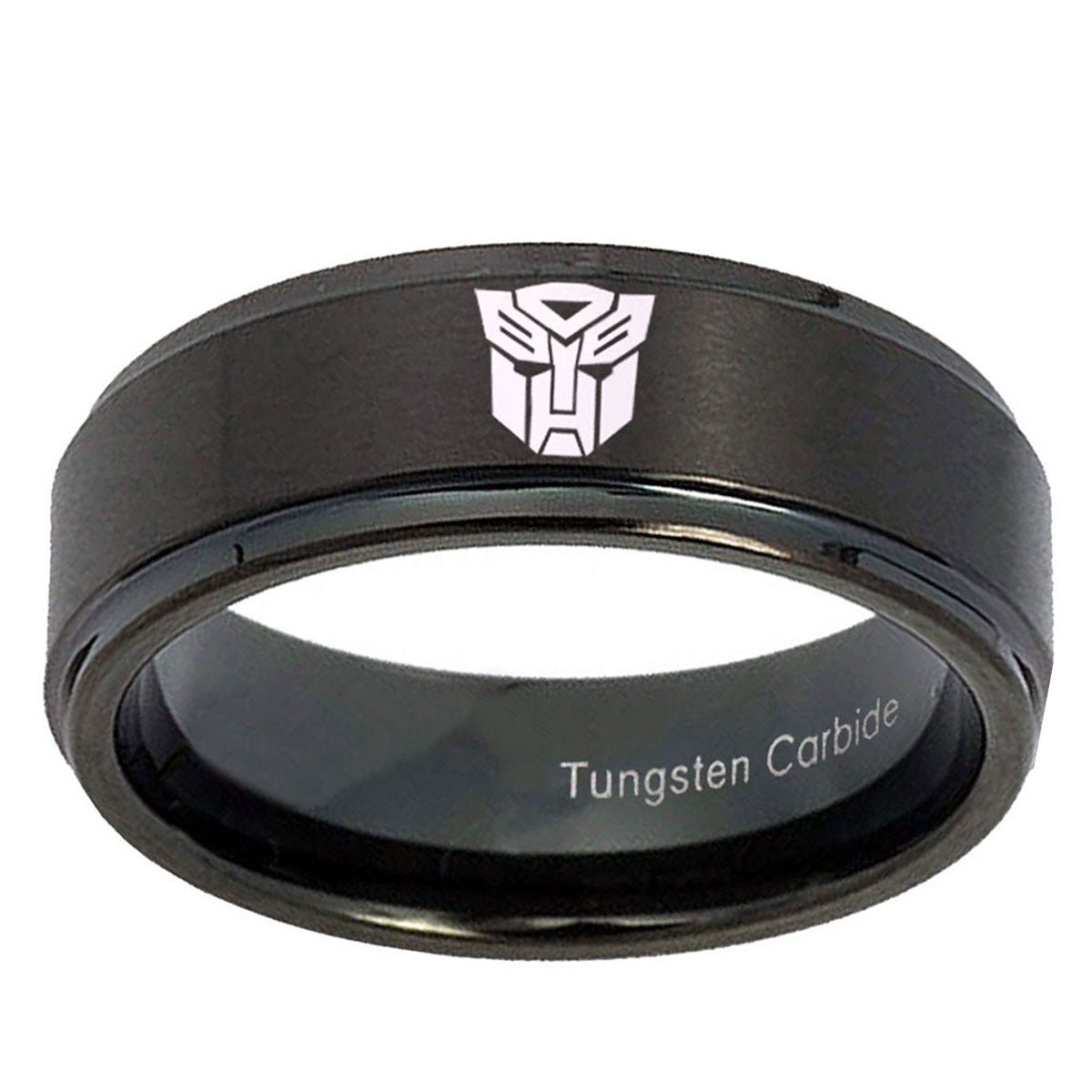 Style the 10mm Transformers Autobot Step Edges Brush Black Tungsten Mens Bands Ring. This brushed black ring with step edges and Transformers Autobot design is perfect for men.