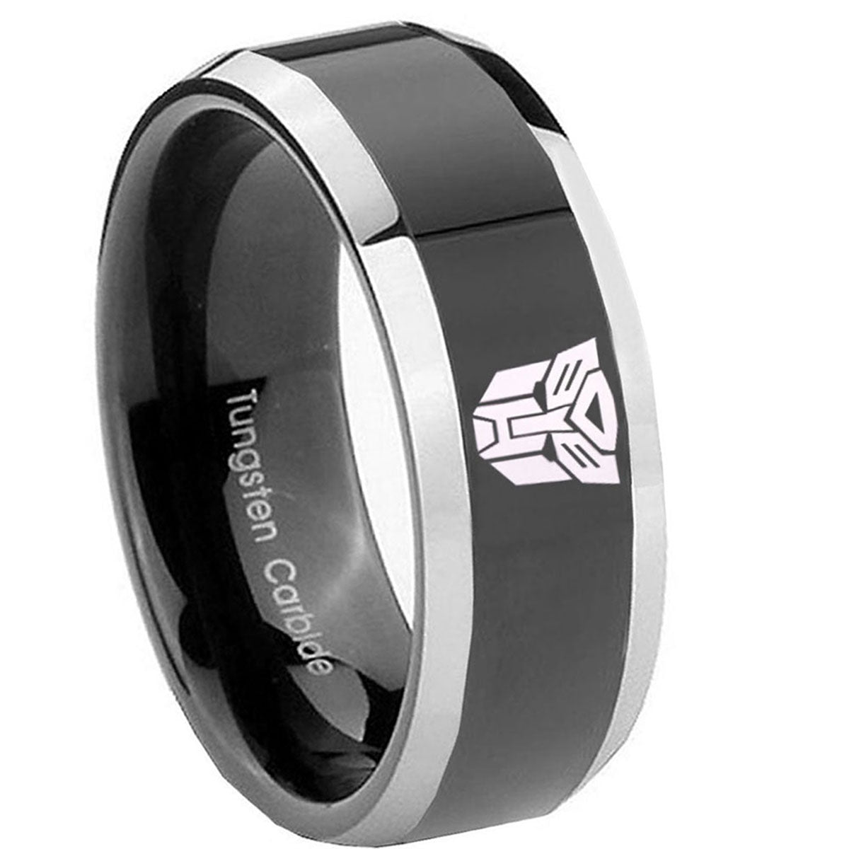 Style the 10mm Transformers Autobot Beveled Edges Glossy Black 2 Tone Tungsten Mens Ring. This glossy black and 2-tone tungsten ring with Transformers Autobot design is perfect for men.