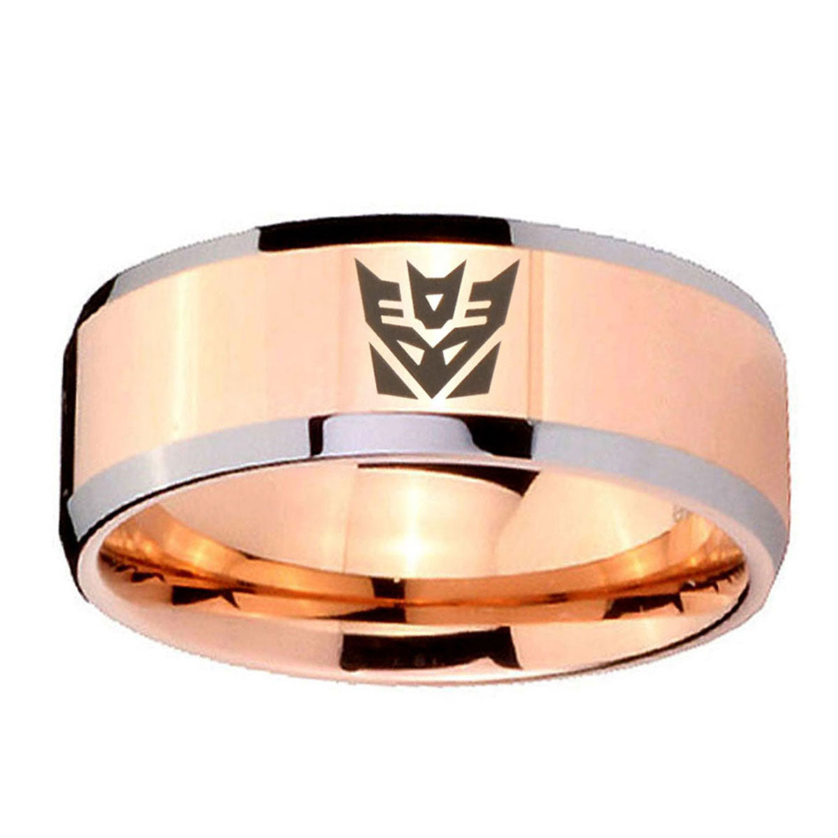 Celebrate with the 10mm Decepticon Transformers Beveled Edges Rose Gold Tungsten Men's Bands Ring. This rose gold tungsten ring with Decepticon design is ideal for weddings.