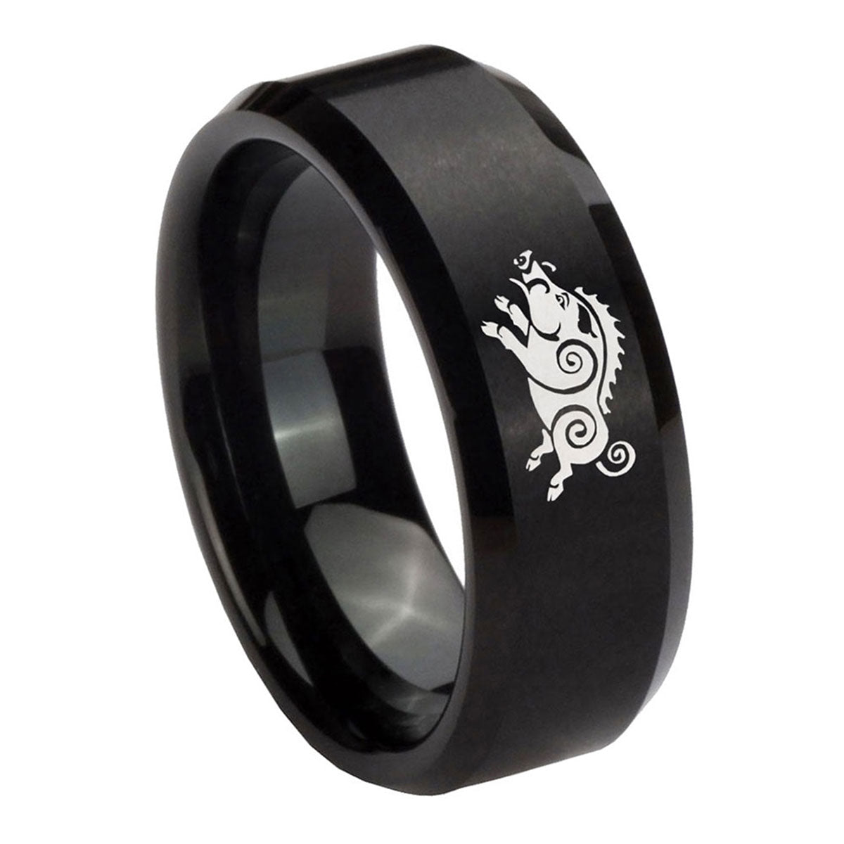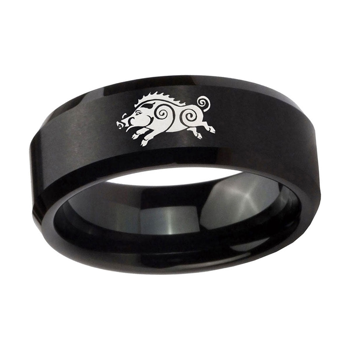 Propose with the 10mm Wild Boar Beveled Edges Brush Black Tungsten Men's Engagement Ring. This brushed black tungsten ring with Wild Boar design is ideal for engagements.