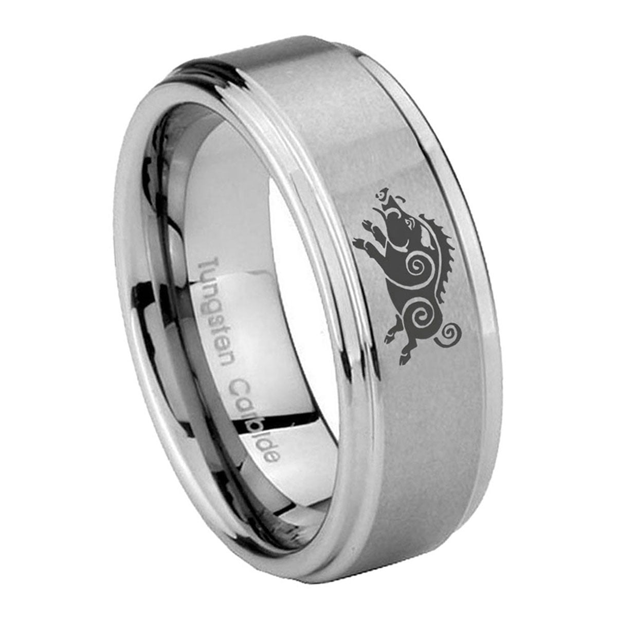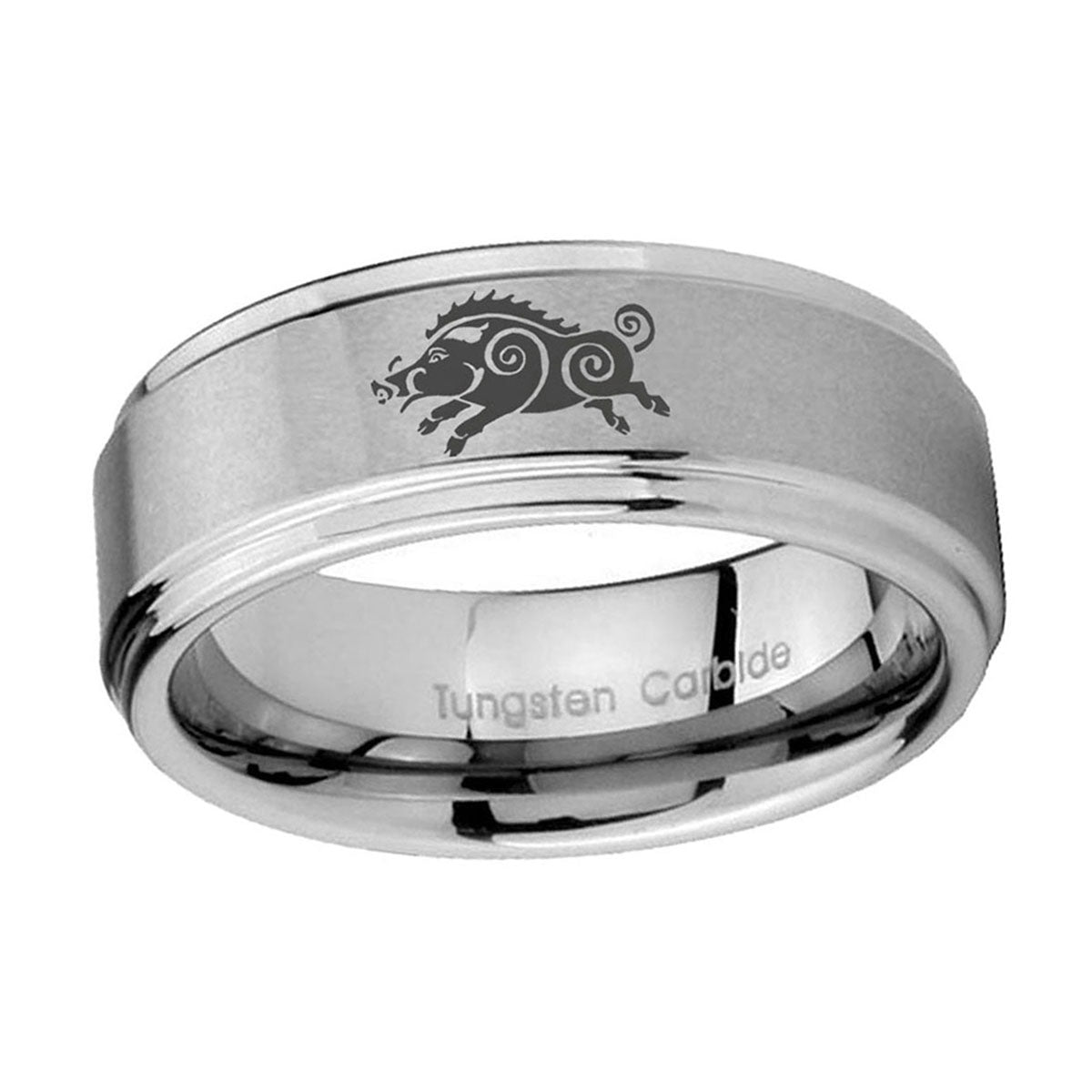 Celebrate with the 10mm Wild Boar Step Edges Brushed Tungsten Carbide Men's Wedding Ring. This brushed tungsten ring with step edges and Wild Boar design is perfect for weddings.