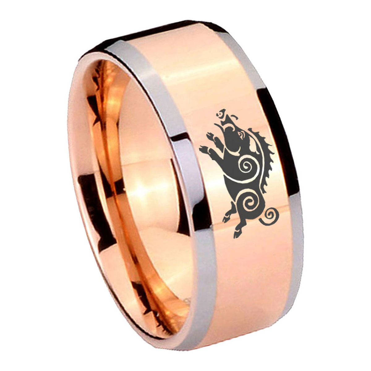Celebrate with the 10mm Wild Boar Beveled Edges Rose Gold Tungsten Wedding Bands Ring. This rose gold tungsten ring with Wild Boar design is perfect for weddings.