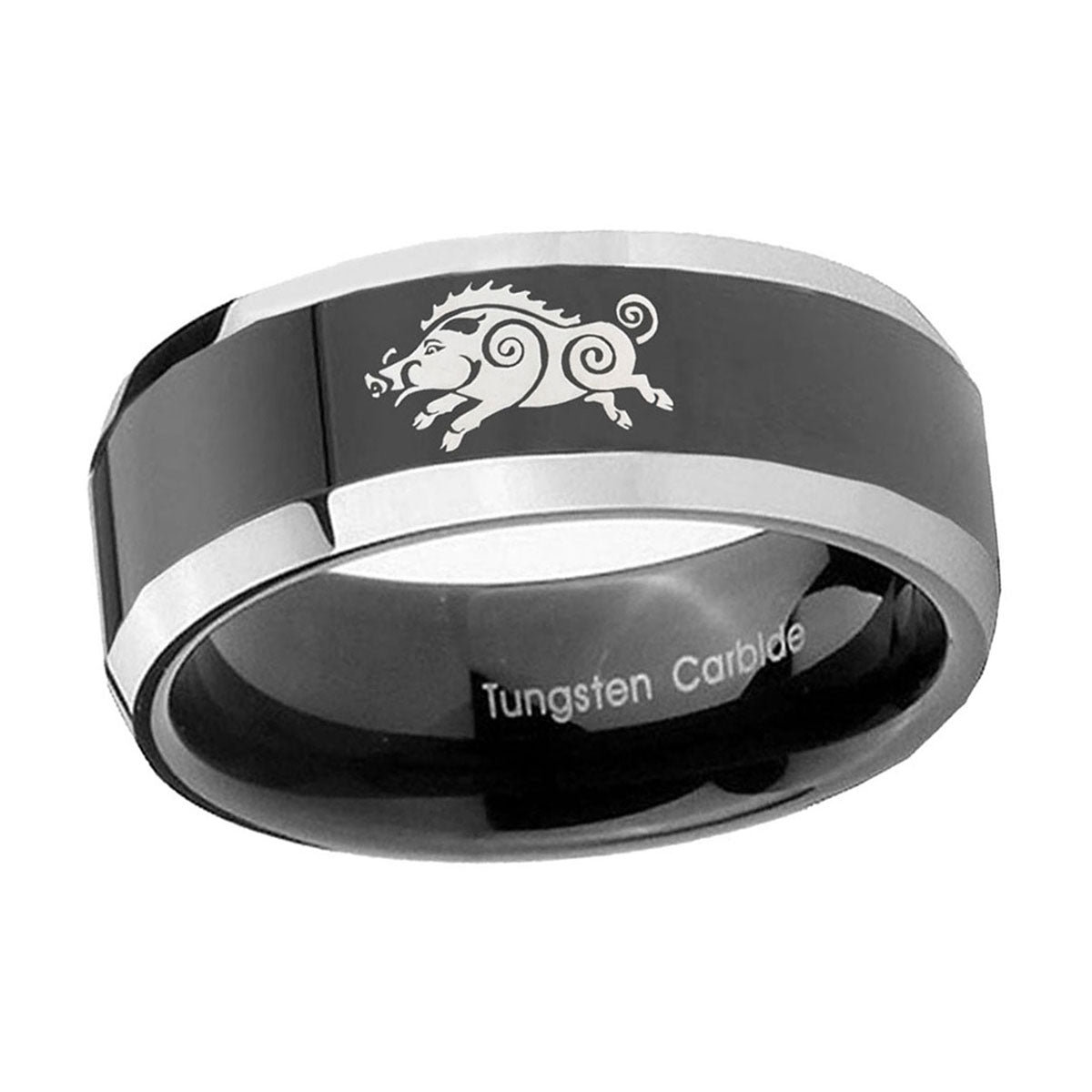 Propose with the 10mm Wild Boar Beveled Glossy Black 2 Tone Tungsten Engagement Ring. This glossy black and 2-tone tungsten ring with Wild Boar design is ideal for engagements.