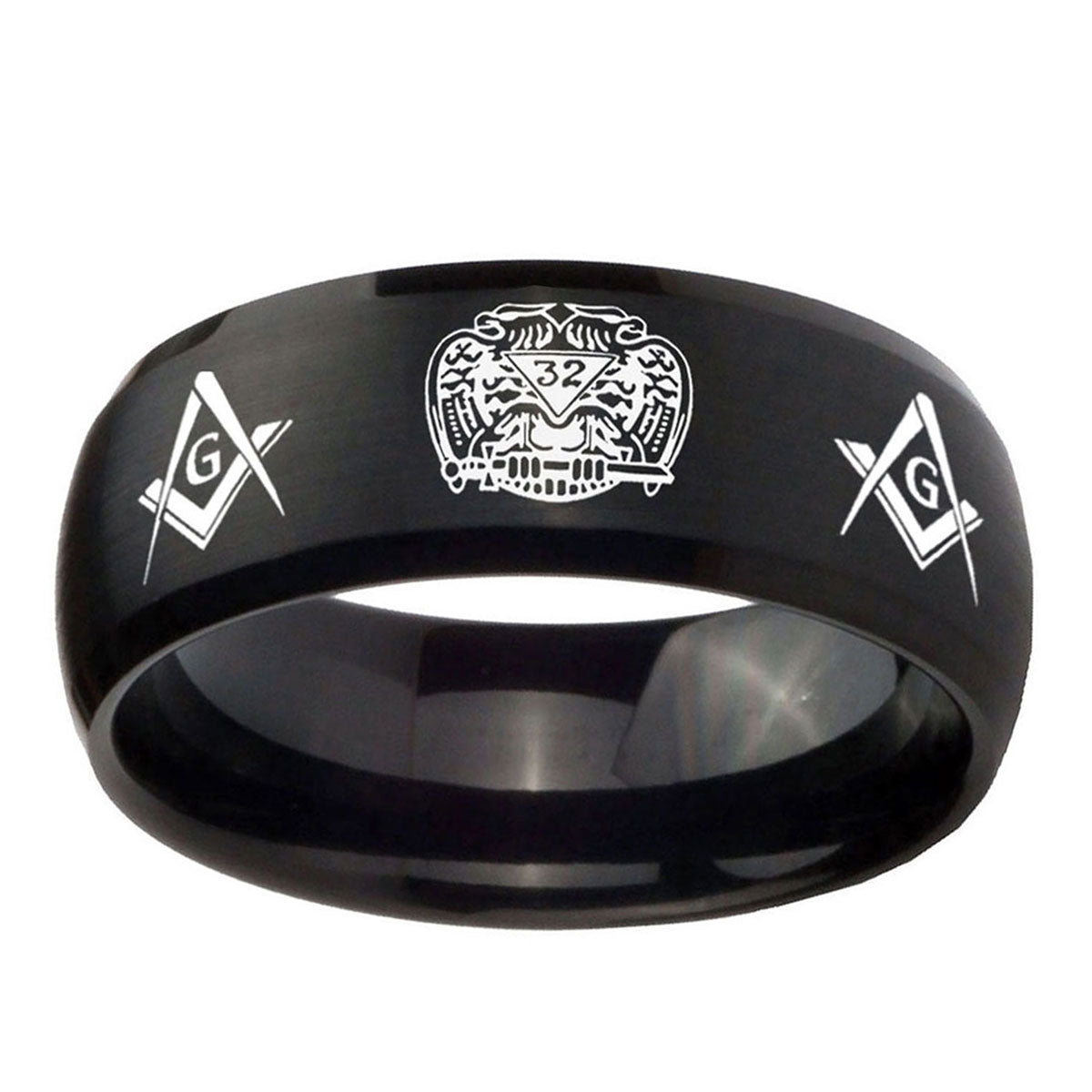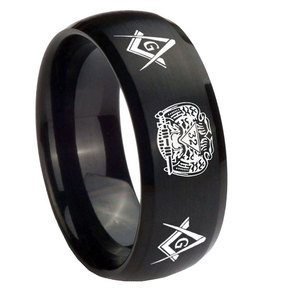 10mm Masonic 32 Design Dome Brush Black Tungsten Carbide Men's Promise Rings