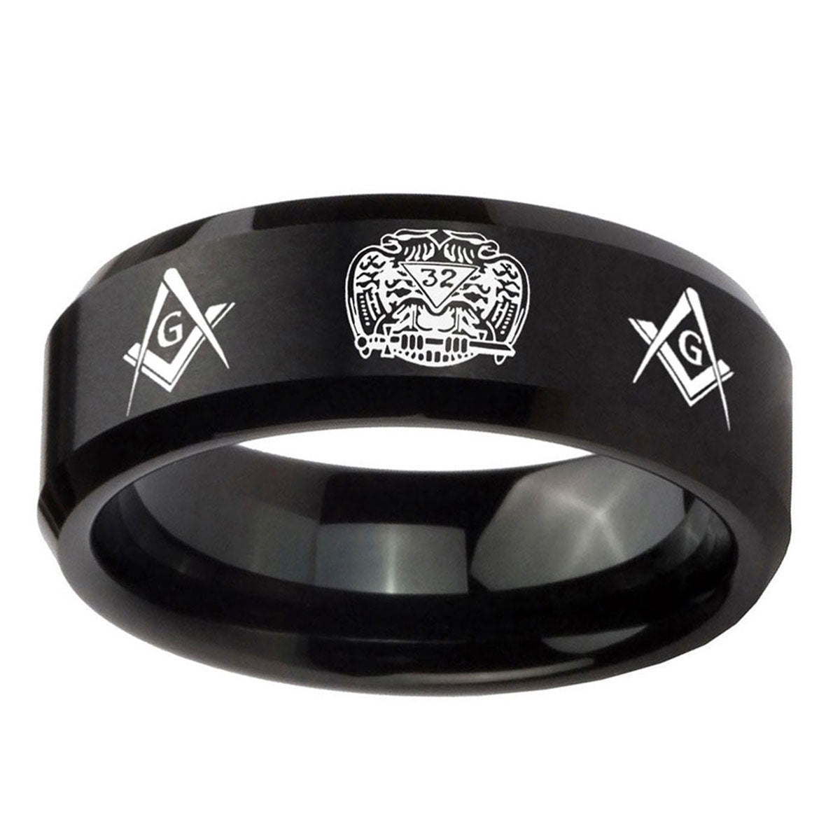 10mm Masonic 32 Design Beveled Edges Brush Black Tungsten Mens Engagement Band