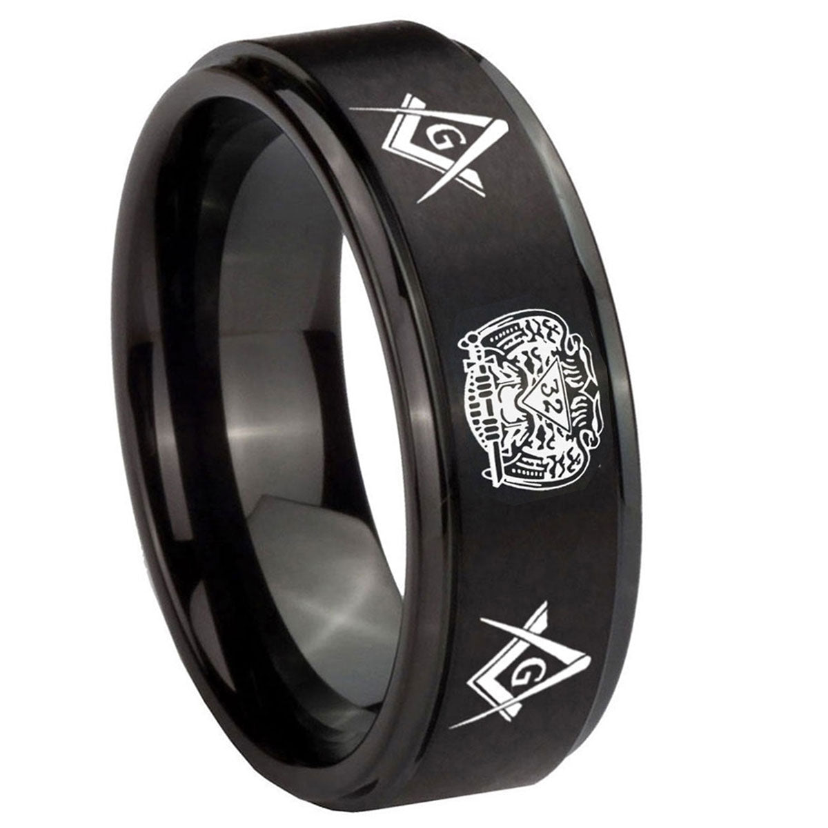 10mm Masonic 32 Design Step Edges Brush Black Tungsten Mens Engagement Ring