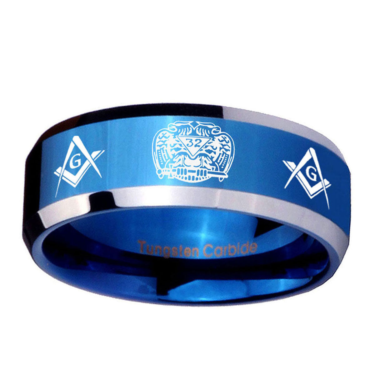 10mm Masonic 32 Design Beveled Edges Blue 2 Tone Tungsten Mens Ring Engraved