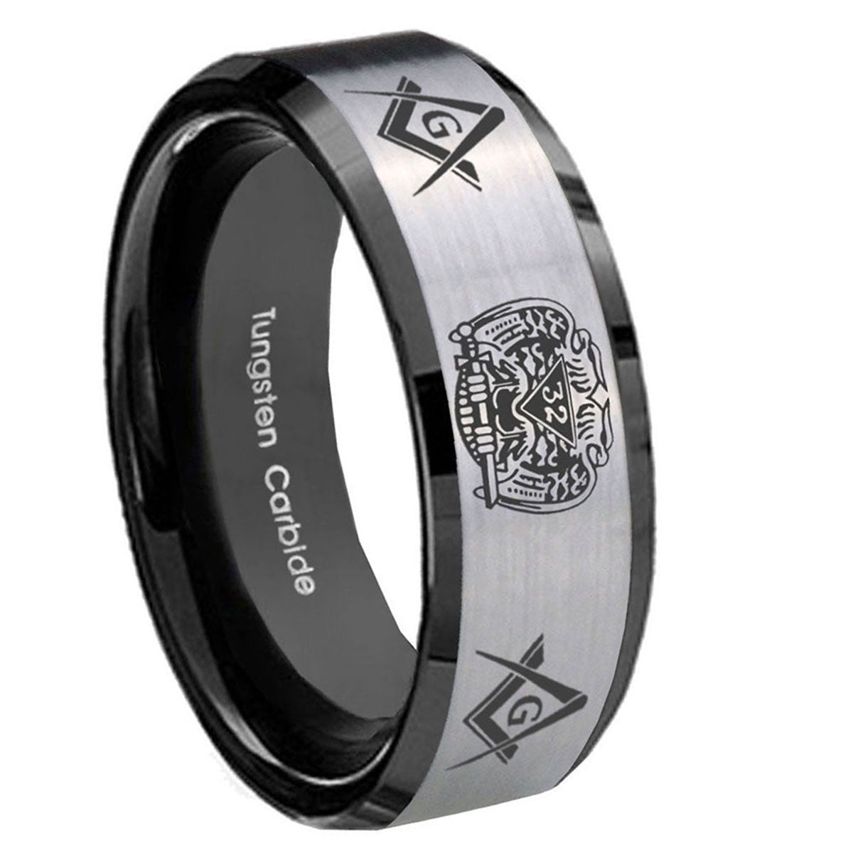 10mm Masonic 32 Design Beveled Brushed Silver Black Tungsten Anniversary Ring
