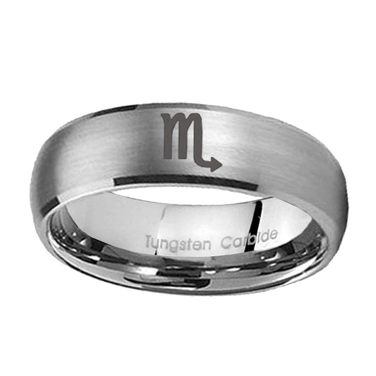 Personalize the 10mm Scorpio Horoscope Dome Brushed Tungsten Carbide Engraved Ring. This brushed tungsten dome ring with Scorpio Horoscope design is perfect for custom engravings.