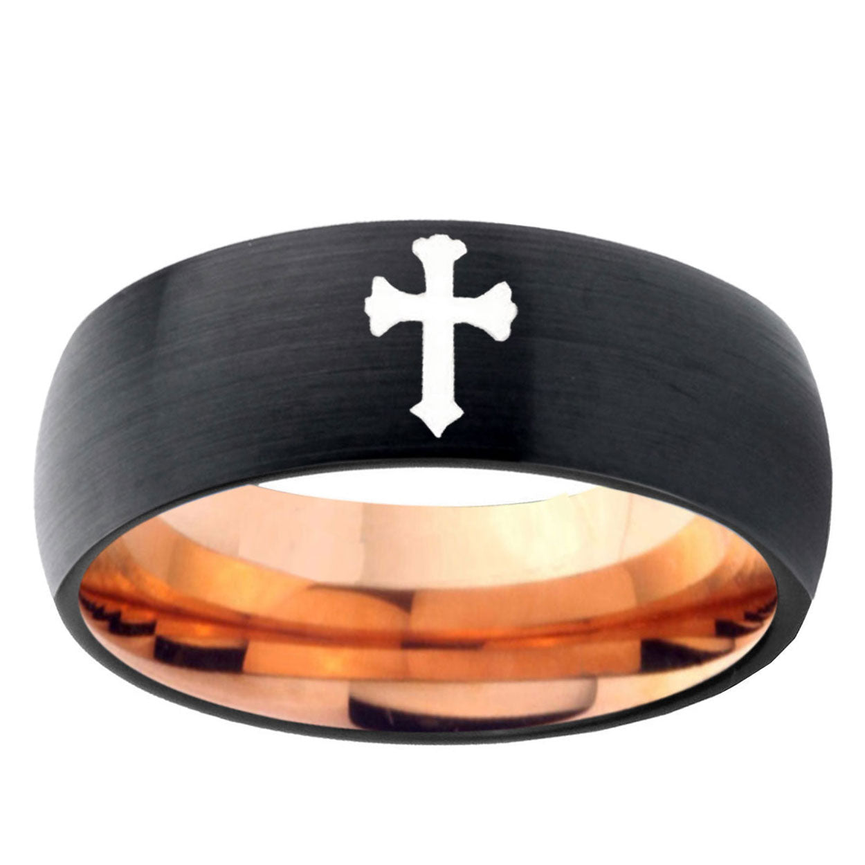 Customize the 10mm Flat Christian Cross Dome Tungsten Rose Gold Custom Ring for Men. This rose gold tungsten dome ring with Flat Christian Cross design is perfect for personalization.