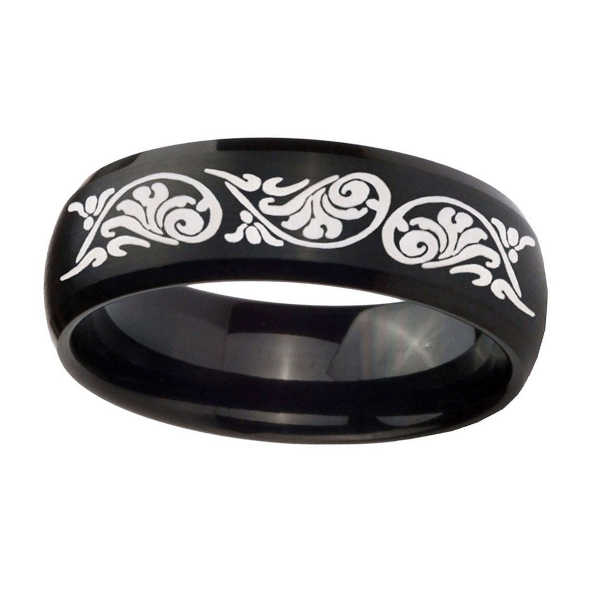 10mm Etched Tribal Pattern Dome Brush Black Tungsten Carbide Engagement Ring