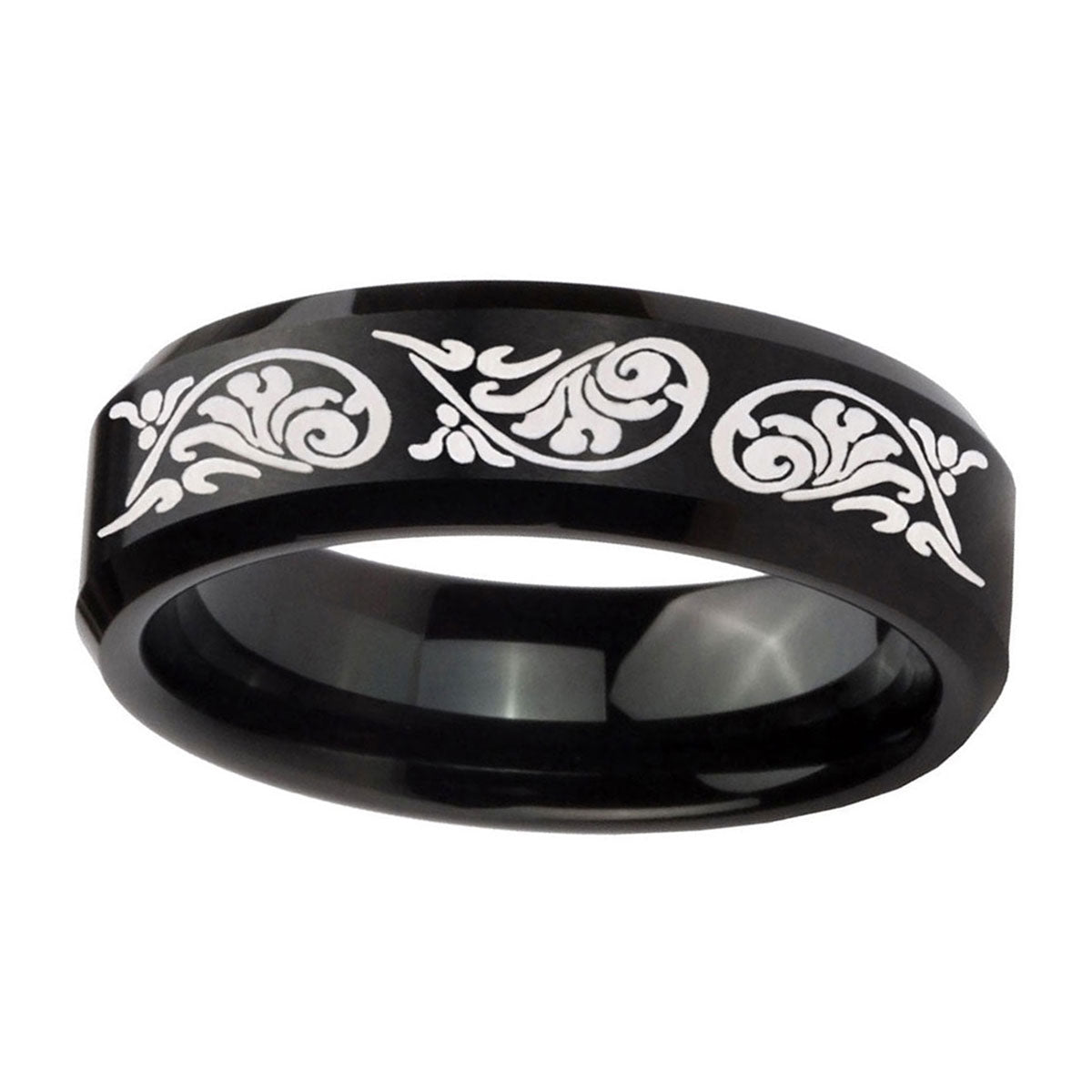 10mm Etched Tribal Pattern Beveled Edges Brush Black Tungsten Anniversary Ring