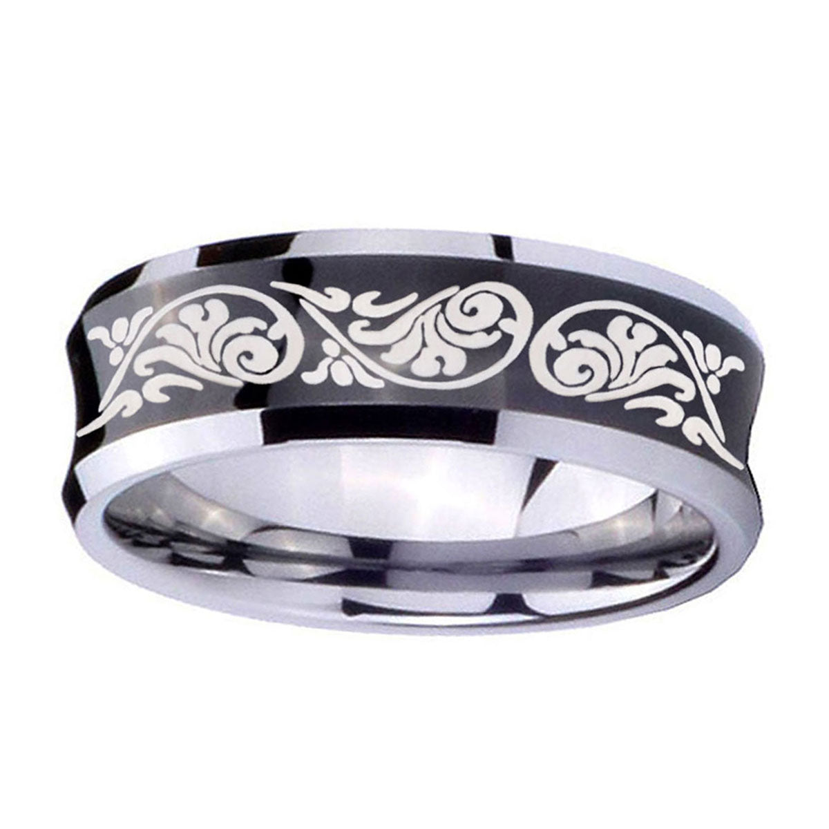 Propose with the 10mm Etched Tribal Pattern Concave Black Tungsten Wedding Engagement Ring. This concave black tungsten ring with Tribal Pattern design is ideal for engagements.
