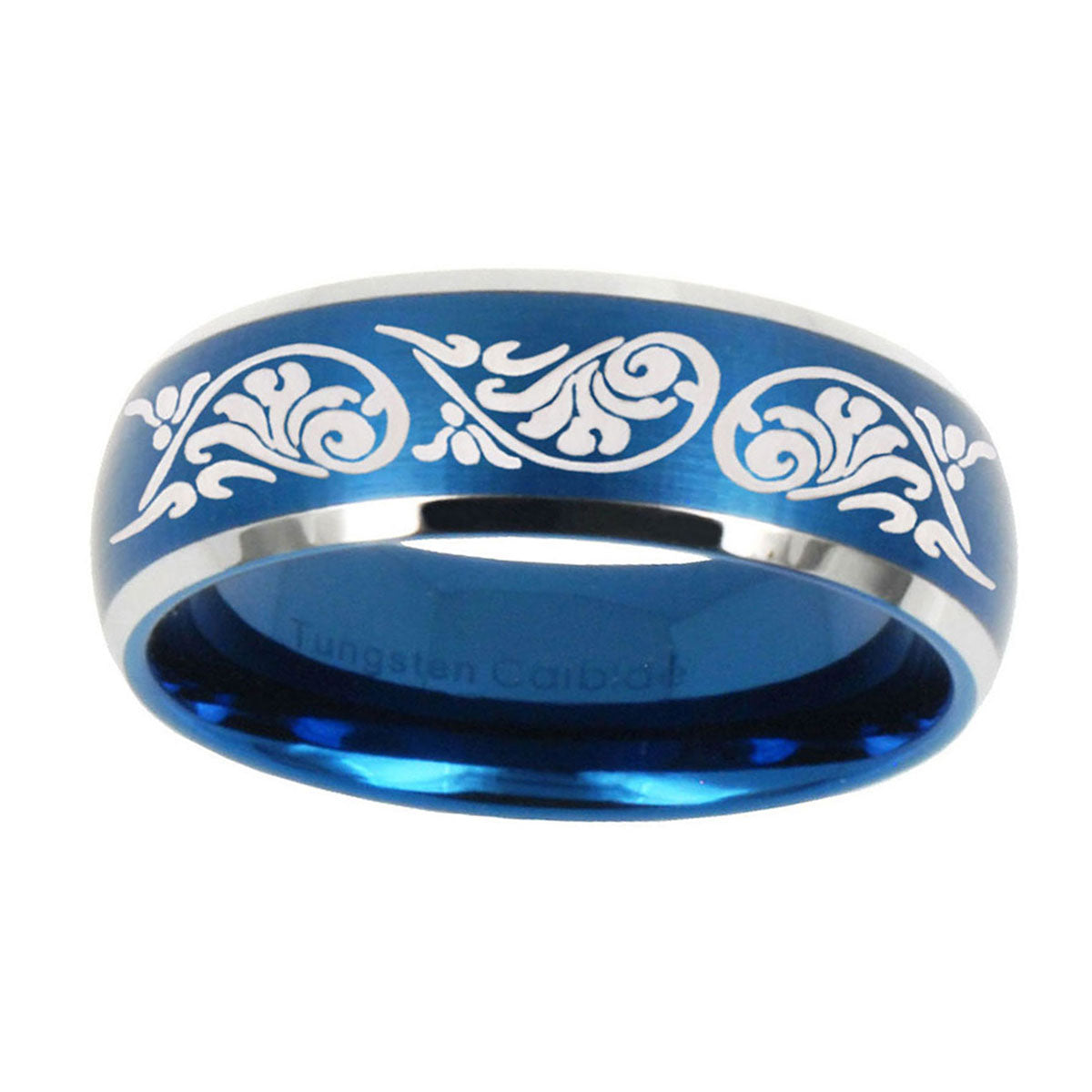 Celebrate with the 10mm Etched Tribal Pattern Dome Brushed Blue 2 Tone Tungsten Custom Mens Ring. This blue and black 2-tone dome ring with Tribal Pattern design is perfect for custom weddings.
