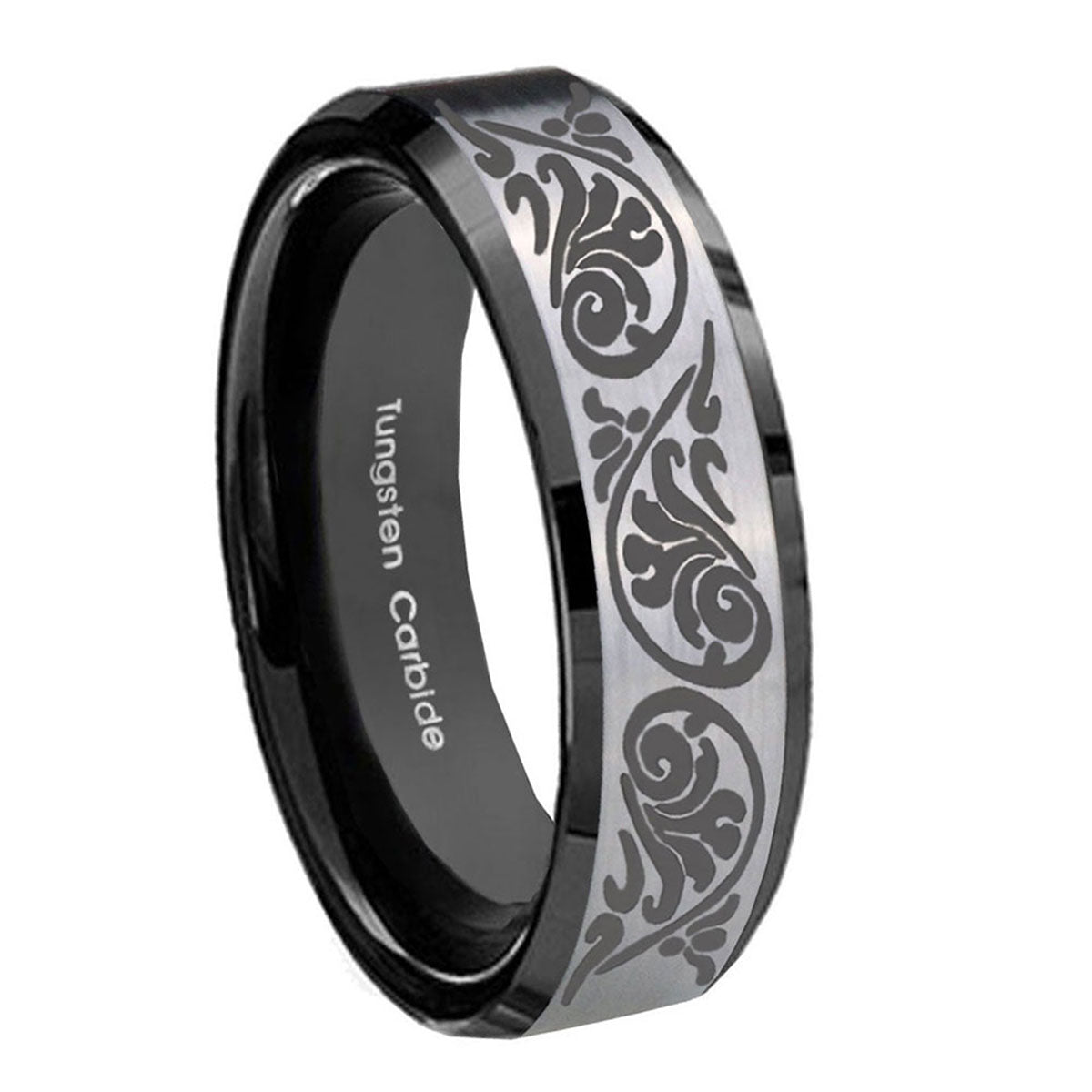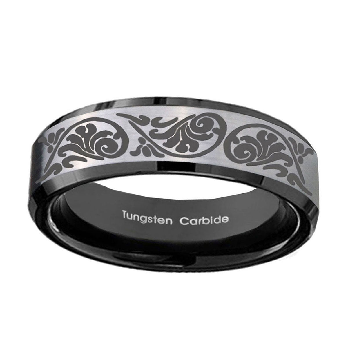 10mm Etched Tribal Pattern Beveled Brushed Silver Black Tungsten Bands Ring
