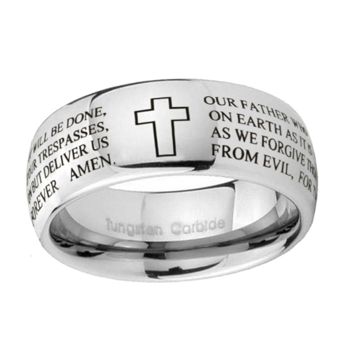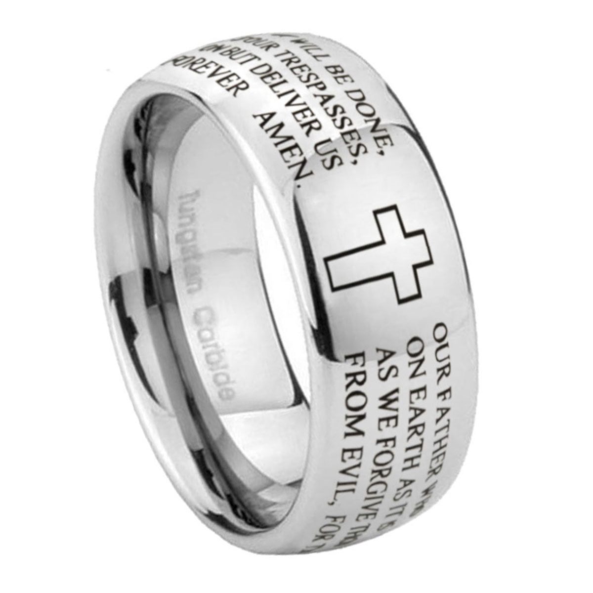 10mm Etched Lord's Prayer Cross Mirror Dome Tungsten Carbide Men's Promise Rings
