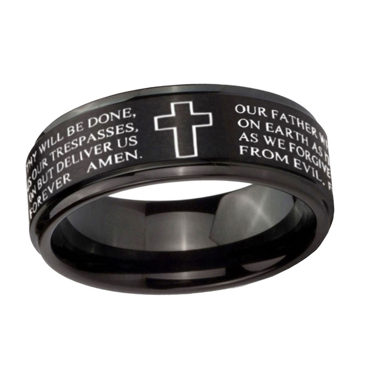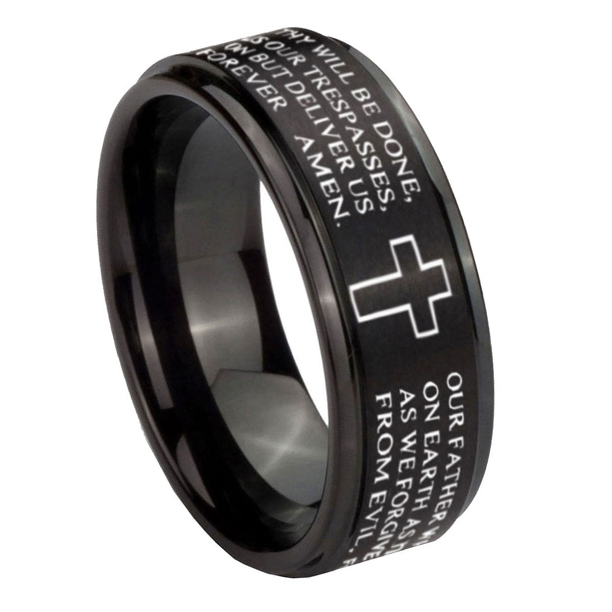 10mm Etched Lord's Prayer Cross Step Edges Brush Black Tungsten Men's Promise Rings