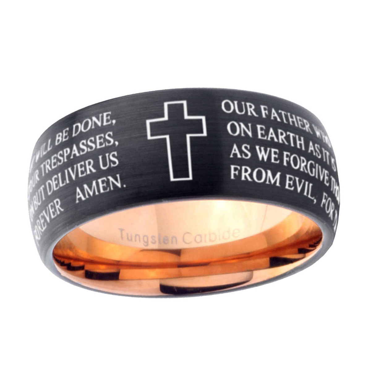 10mm Etched Lord's Prayer Cross Dome Tungsten Rose Gold Custom Ring for Men