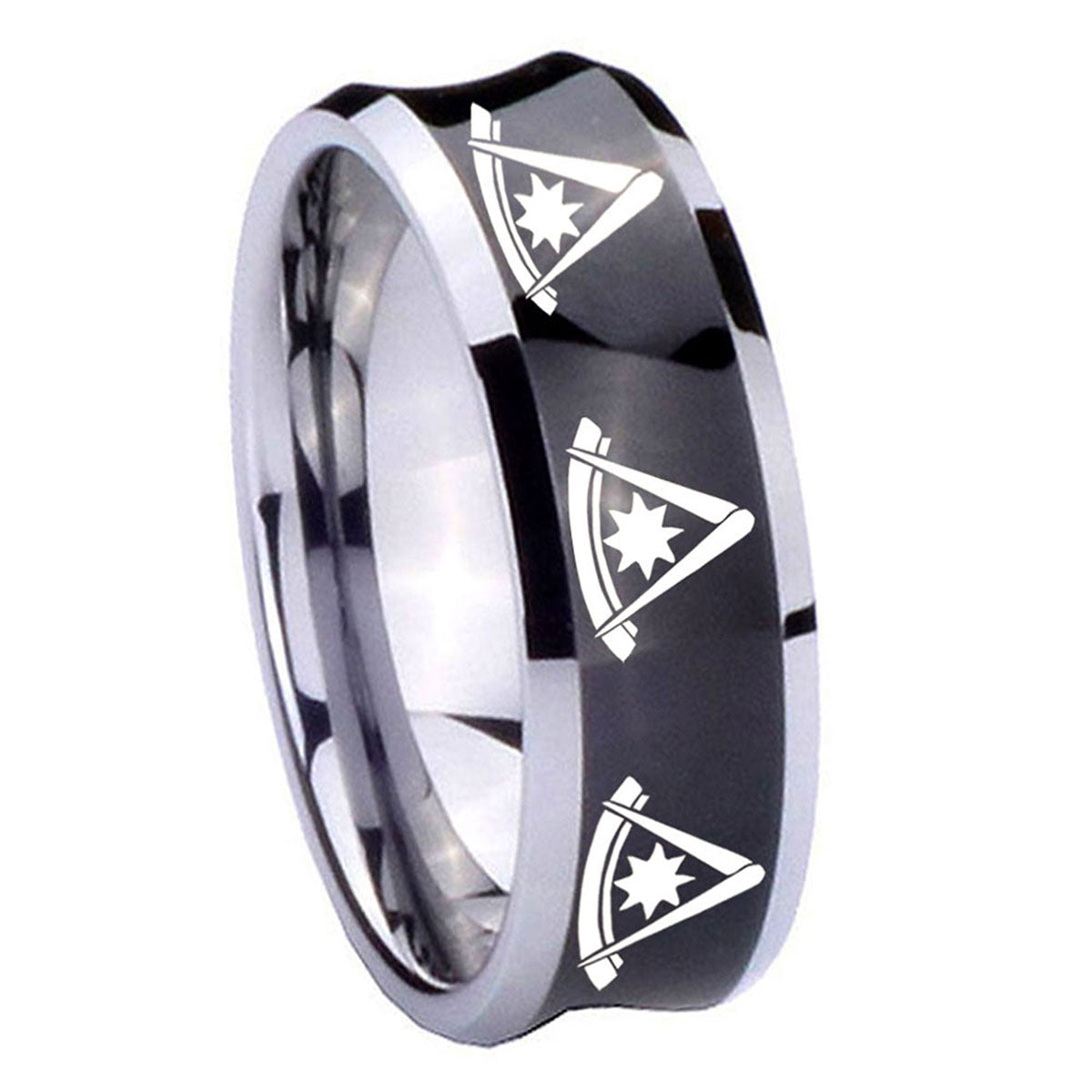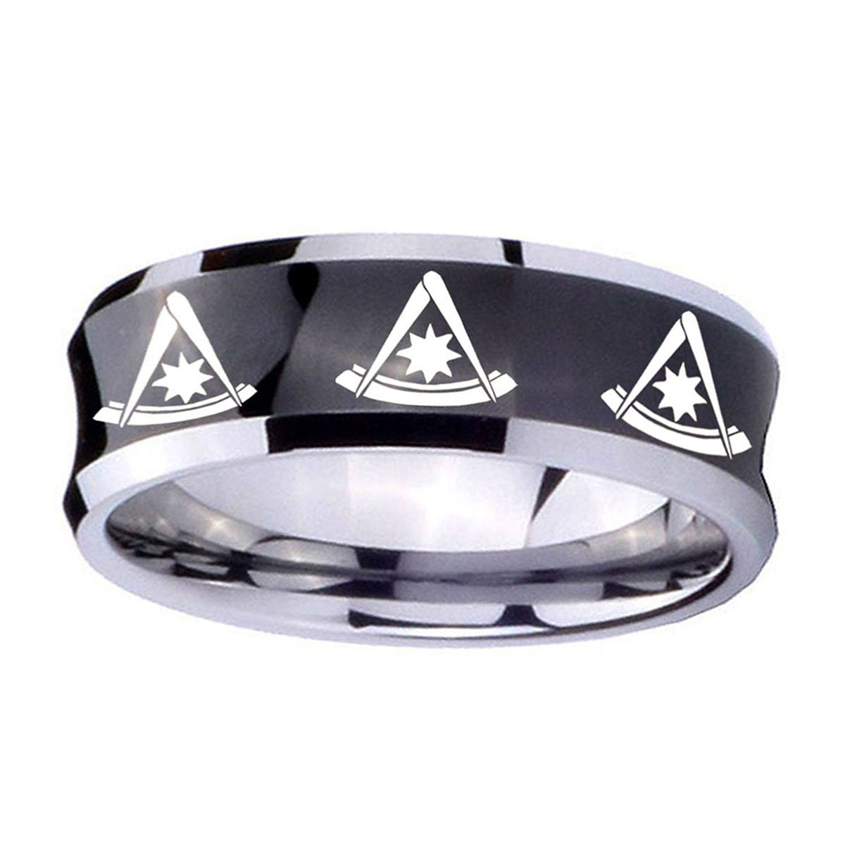 Customize the 10mm Multiple Pester Master Masonic Concave Black Tungsten Custom Mens Ring. This concave black tungsten ring with Multiple Pester Master Masonic design is perfect for personalization.