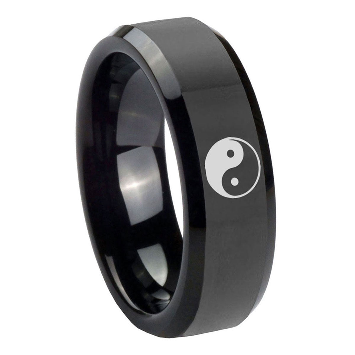 10mm Yin Yang Beveled Edges Black Tungsten Carbide Engraved Ring
