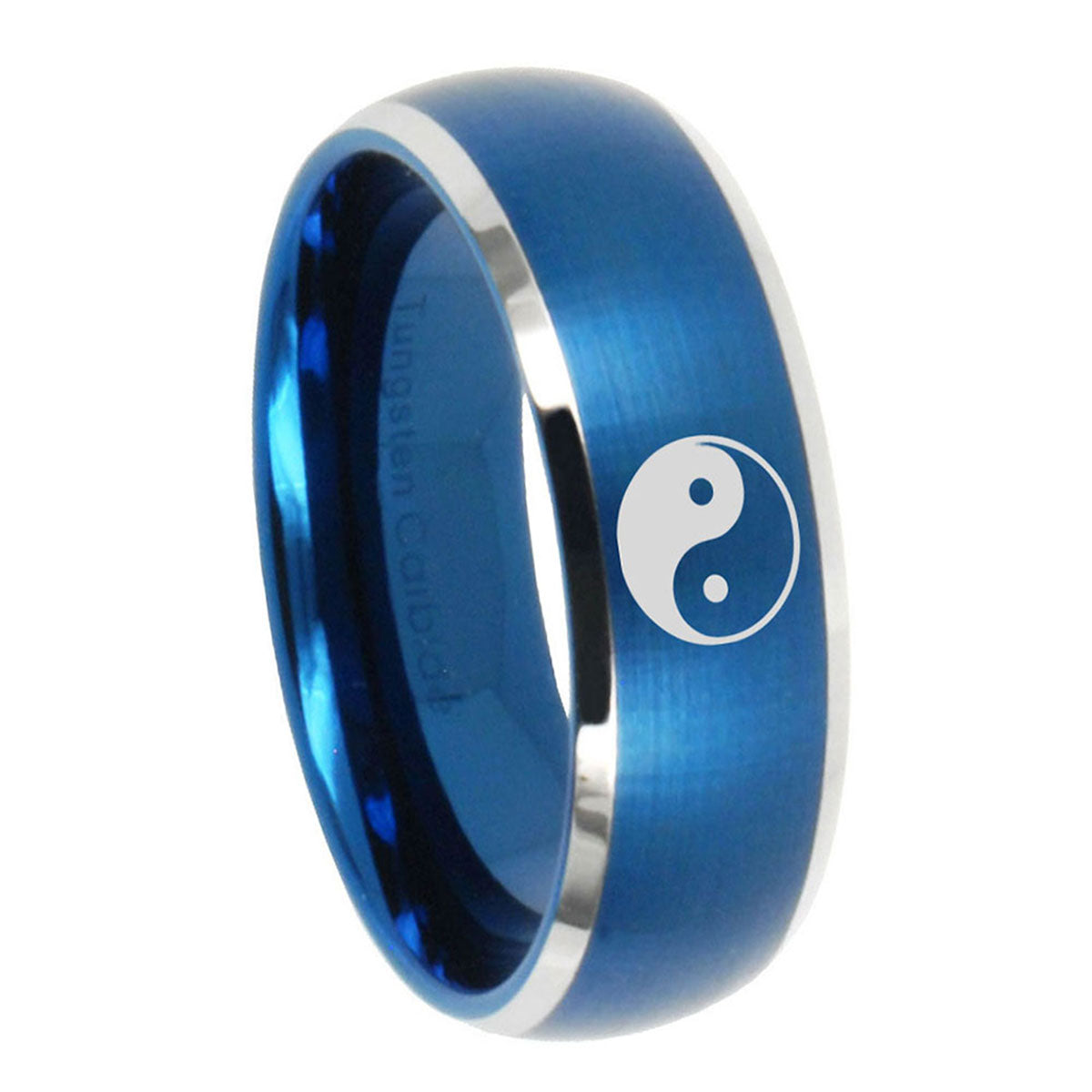 10mm Yin Yang Dome Brushed Blue 2 Tone Tungsten Carbide Custom Mens Ring