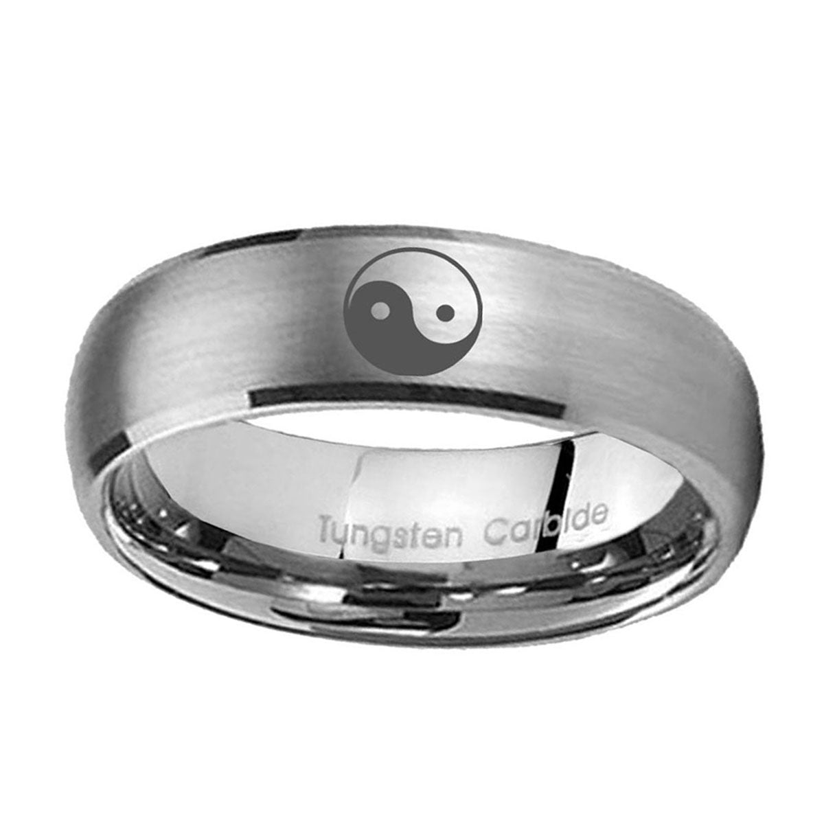 Personalize the 10mm Yin Yang Dome Brushed Tungsten Carbide Wedding Engraving Ring. This brushed tungsten dome ring with Yin Yang design is perfect for custom engravings.