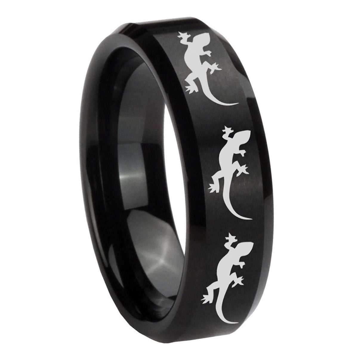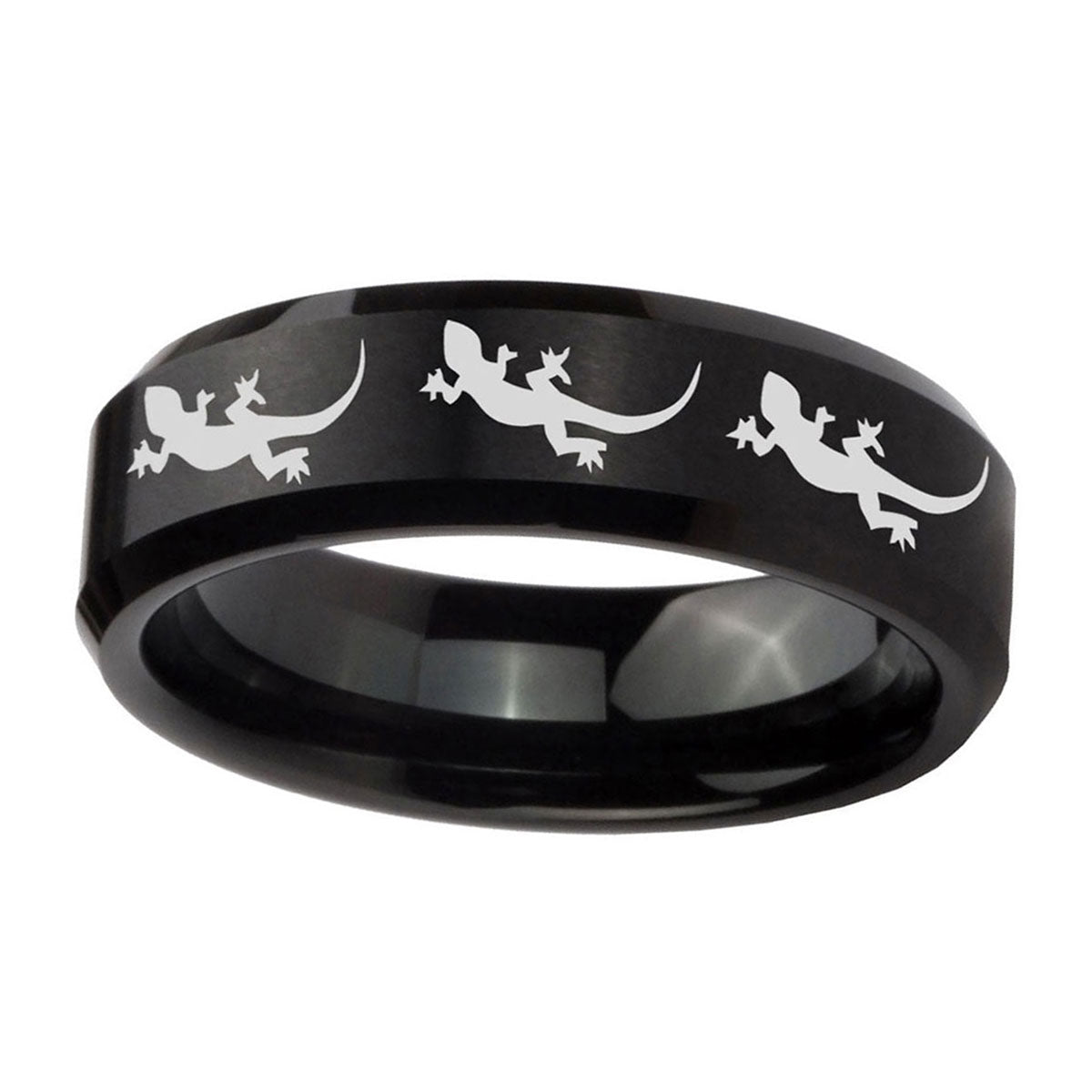Style the 10mm Multiple Lizard Beveled Edges Brush Black Tungsten Carbide Mens Bands Ring. This brushed black tungsten ring with Multiple Lizard design is perfect for men.