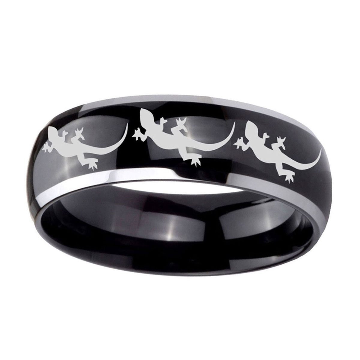 Personalize the 10mm Multiple Lizard Dome Glossy Black 2 Tone Tungsten Mens Ring Personalized. This glossy black and 2-tone dome ring with Multiple Lizard design is perfect for custom engravings.