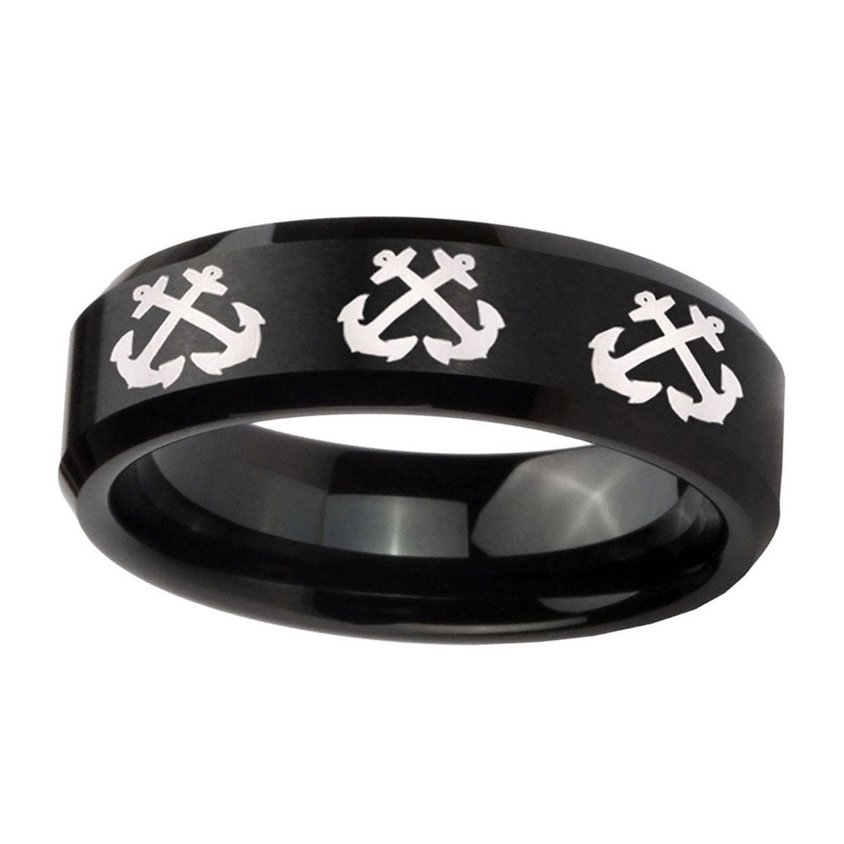 Propose with the 10mm Multiple Anchor Beveled Edges Brush Black Tungsten Mens Engagement Band. This brushed black tungsten ring with Multiple Anchor design is ideal for engagements.