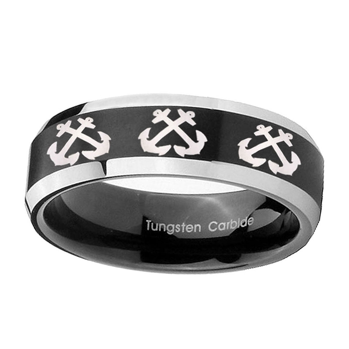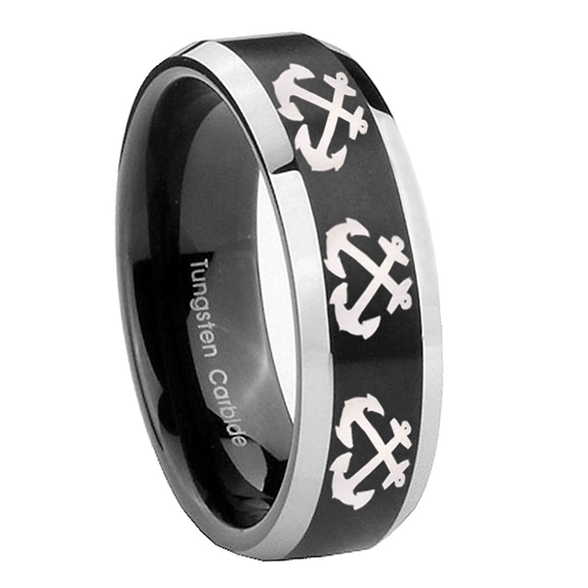 Make a promise with the 10mm Multiple Anchor Beveled Brush Black 2 Tone Tungsten Men's Promise Rings. This brushed black and 2-tone tungsten ring with Multiple Anchor design is ideal for commitments.