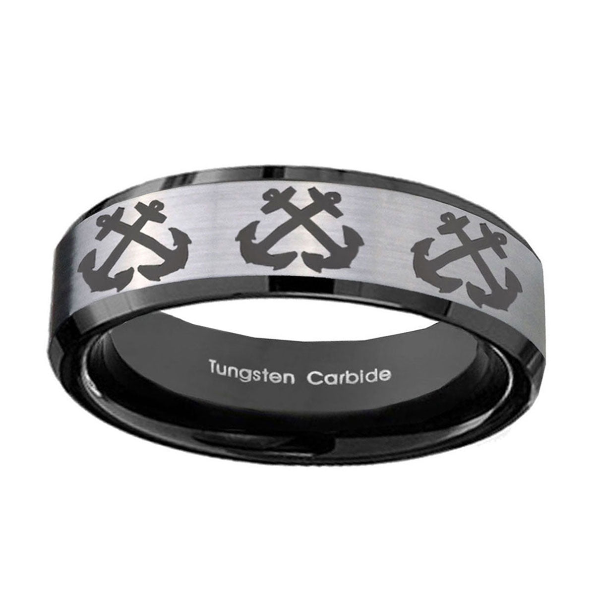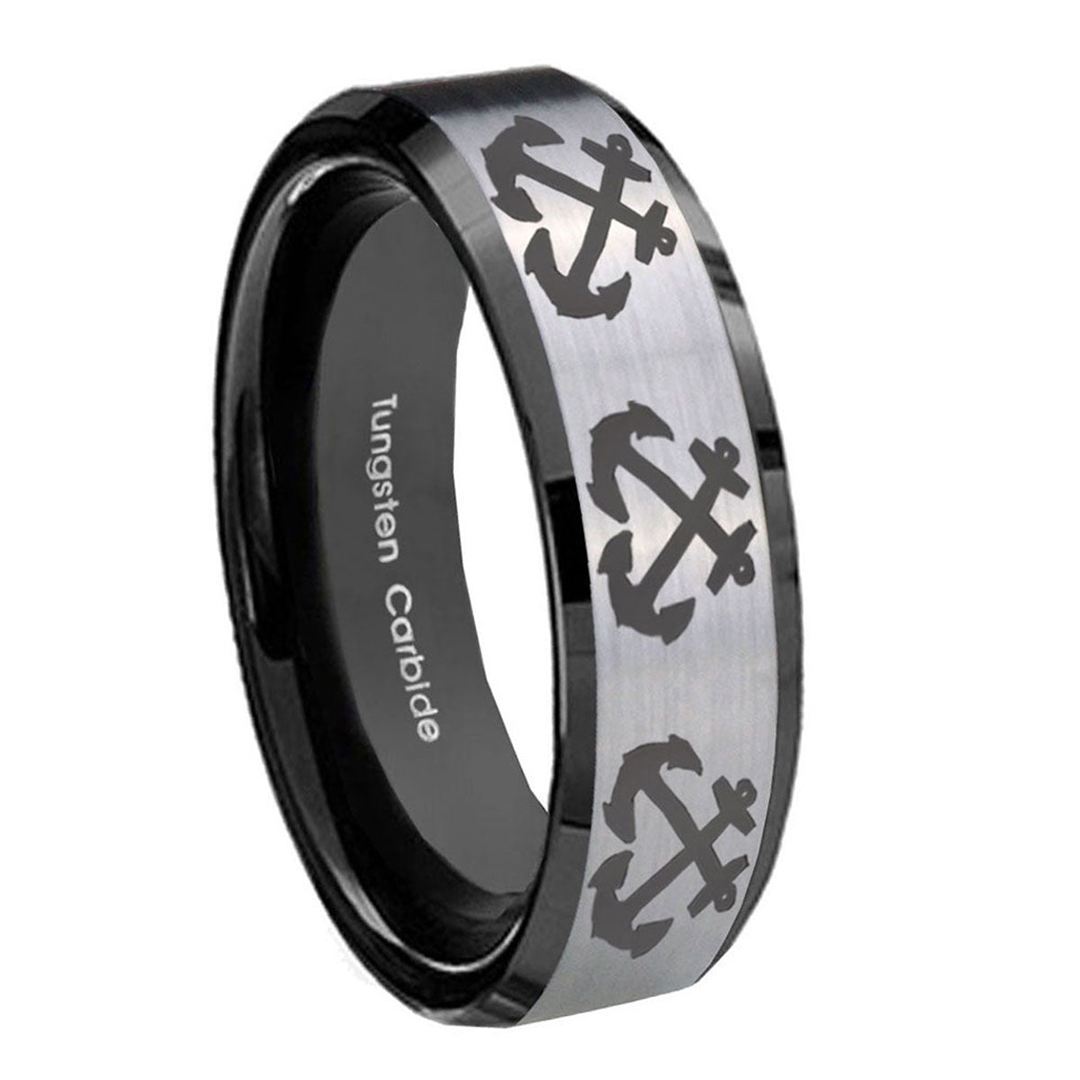 Personalize the 10mm Multiple Anchor Beveled Brushed Silver Black Tungsten Personalized Ring. This silver and black tungsten ring with Multiple Anchor design is perfect for custom engravings.