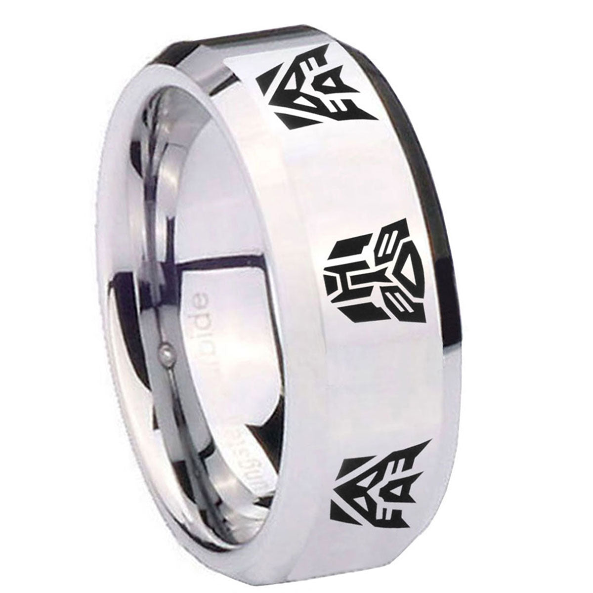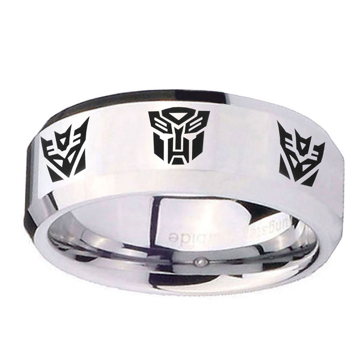 Propose with the 10mm Transformers Autobot Decepticon Beveled Silver Tungsten Men's Engagement Ring. This silver tungsten ring with Transformers Autobot Decepticon design is ideal for engagements.