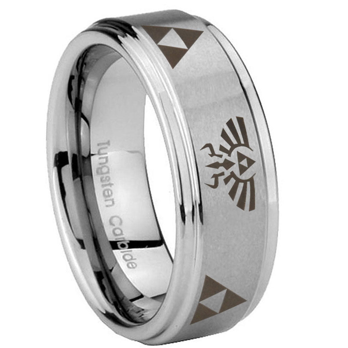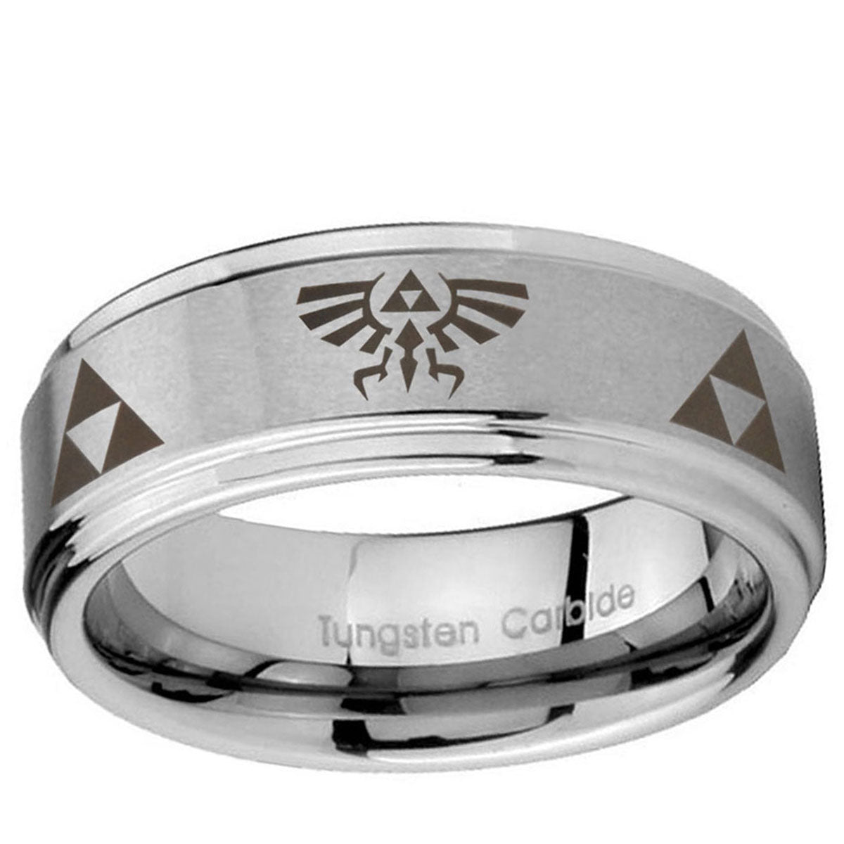 Propose with the 10mm Legend of Zelda Step Edges Brushed Tungsten Carbide Engagement Ring. This brushed tungsten ring with Legend of Zelda design and step edges is ideal for engagements.