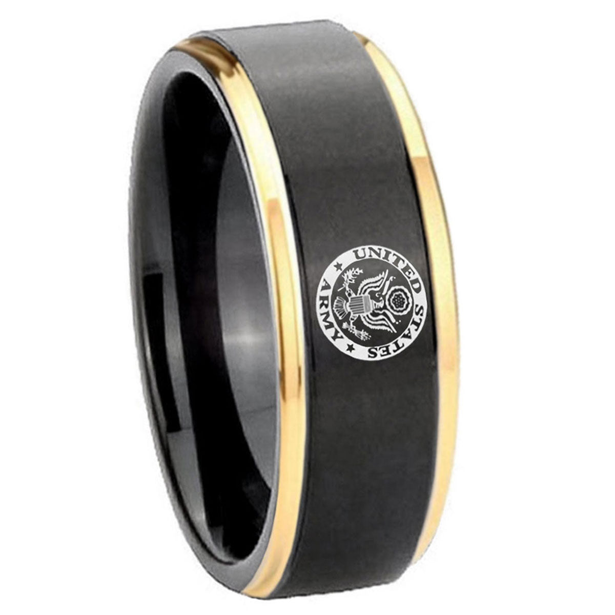 Celebrate with the 10mm U.S. Army Gold Step Edges Black Tungsten Carbide Wedding Ring. This gold and black tungsten ring with U.S. Army design is perfect for weddings.