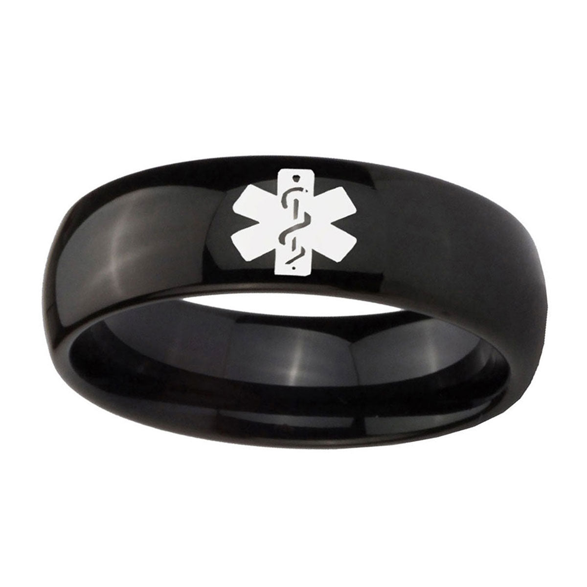 Celebrate milestones with the 10mm Medical Alert Dome Black Tungsten Carbide Mens Anniversary Ring. This dome-shaped black tungsten ring with Medical Alert design is perfect for anniversaries.