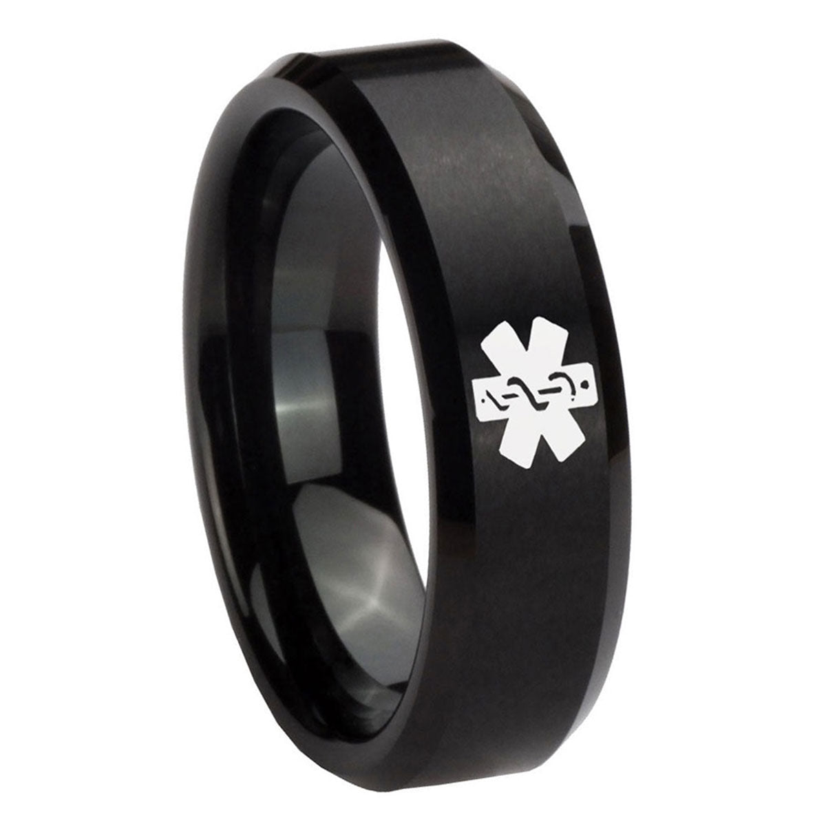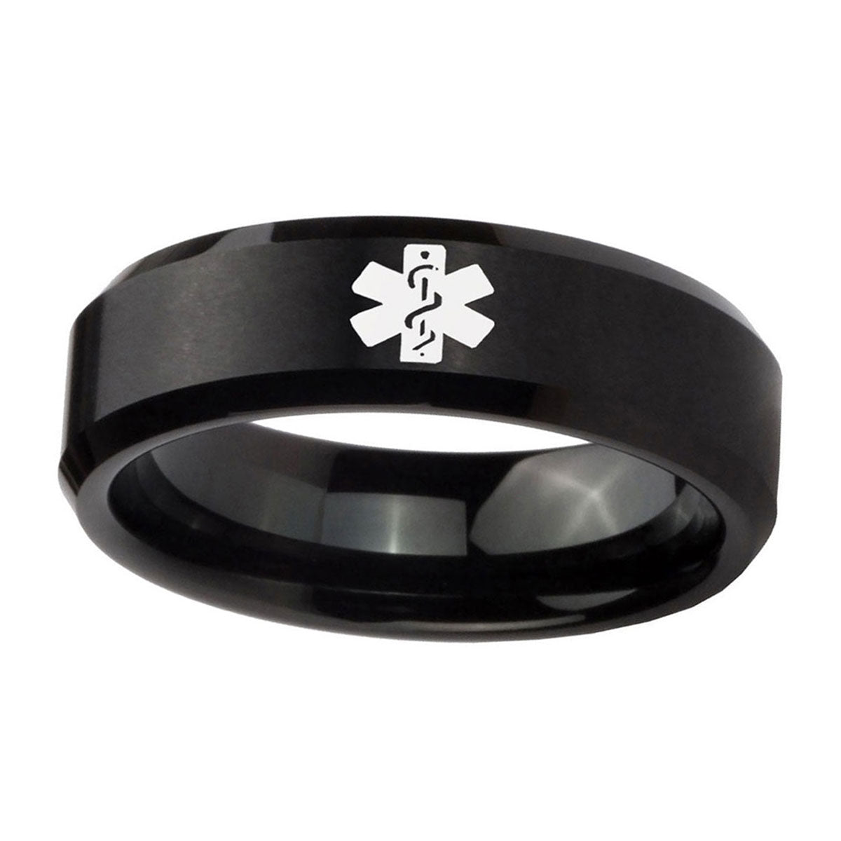 Style the 10mm Medical Alert Beveled Edges Brush Black Tungsten Carbide Men's Bands Ring. This brushed black tungsten ring with Medical Alert design is perfect for men.