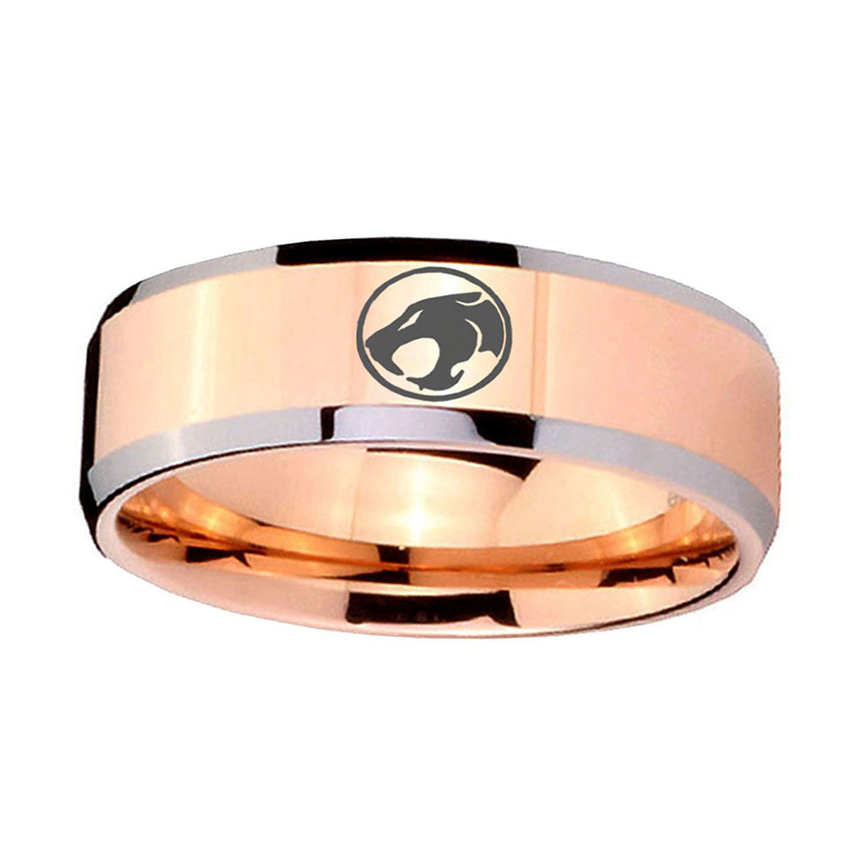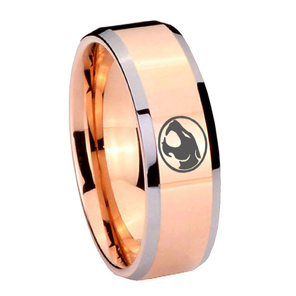 Celebrate with the 10mm Thundercat Beveled Edges Rose Gold Tungsten Carbide Wedding Band Mens. This rose gold tungsten ring with Thundercat design is perfect for weddings.