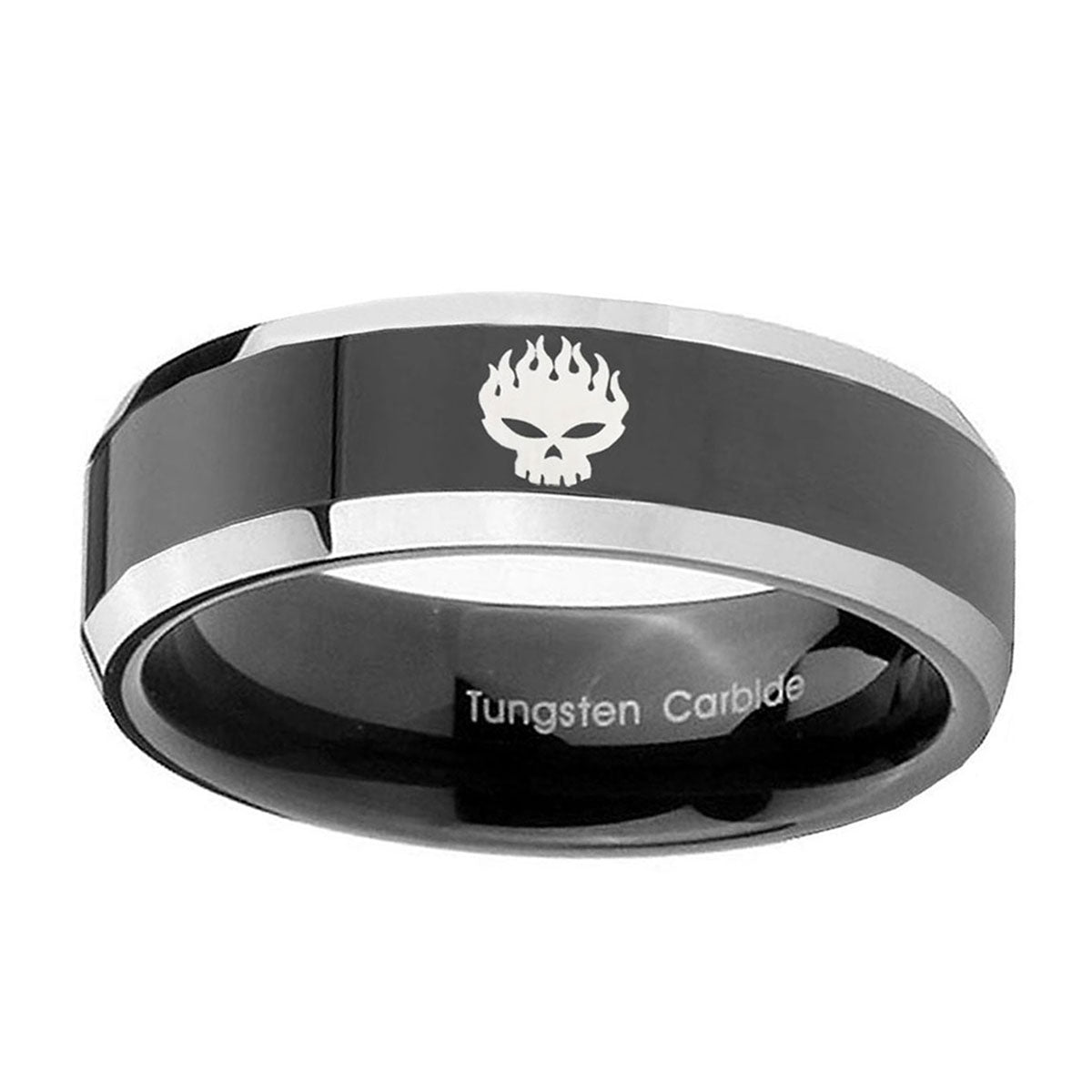 Propose with the 10mm Offspring Beveled Edges Glossy Black 2 Tone Tungsten Engagement Ring. This glossy black and 2-tone tungsten ring with Offspring design is ideal for engagements.