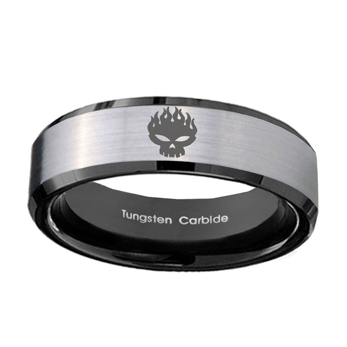 Celebrate with the 10mm Offspring Beveled Edges Brushed Silver Black Tungsten Men's Wedding Band. This silver and black tungsten ring with Offspring design is perfect for weddings.