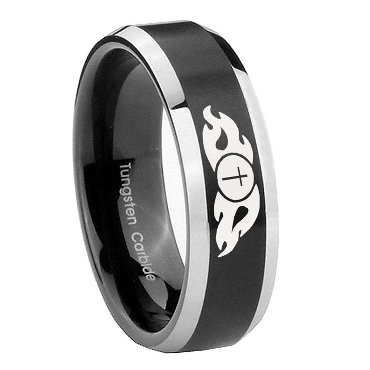 Celebrate with the 10mm Flamed Cross Beveled Edges Brush Black 2 Tone Tungsten Men's Wedding Ring. This brushed black and 2-tone tungsten ring with Flamed Cross design is perfect for weddings.