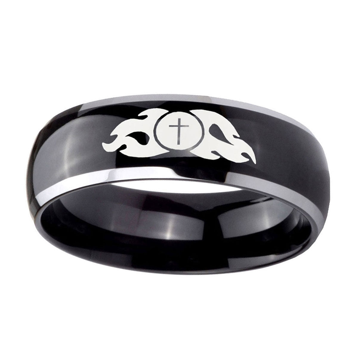 Celebrate with the 10mm Flamed Cross Dome Glossy Black 2 Tone Tungsten Carbide Wedding Bands Ring. This glossy black and 2-tone dome ring with Flamed Cross design is perfect for weddings.