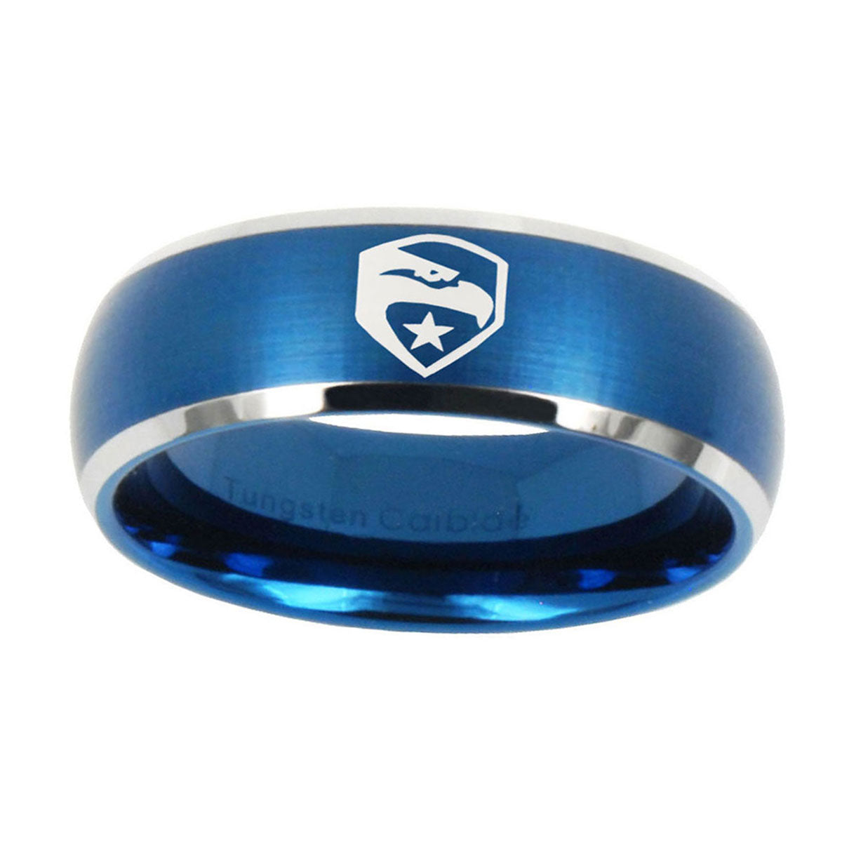 Celebrate with the 10mm GI Joe Eagle Dome Brushed Blue 2 Tone Tungsten Carbide Wedding Band Mens. This blue and black 2-tone dome ring with GI Joe Eagle design is perfect for weddings.