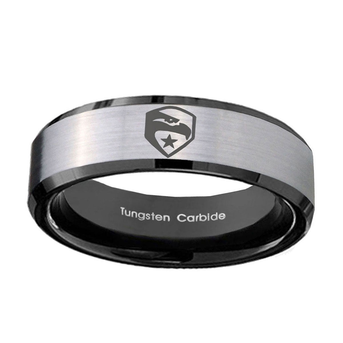 Propose with the 10mm GI Joe Eagle Beveled Brushed Silver Black Tungsten Wedding Engagement Ring. This silver and black tungsten ring with GI Joe Eagle design is ideal for engagements.