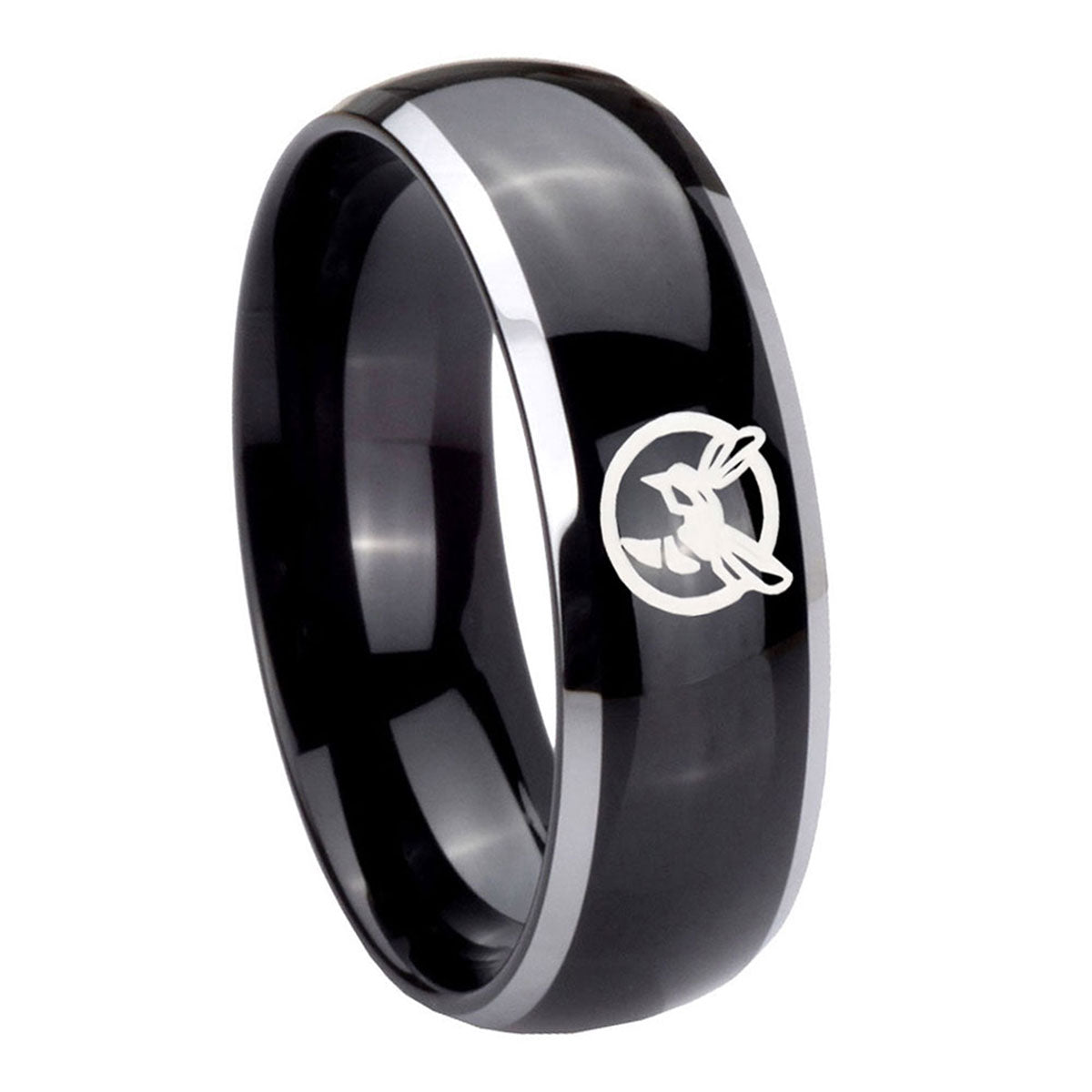 Celebrate with the 10mm Honey Bee Dome Glossy Black 2 Tone Tungsten Carbide Mens Wedding Ring. This glossy black and 2-tone dome ring with Honey Bee design is perfect for weddings.