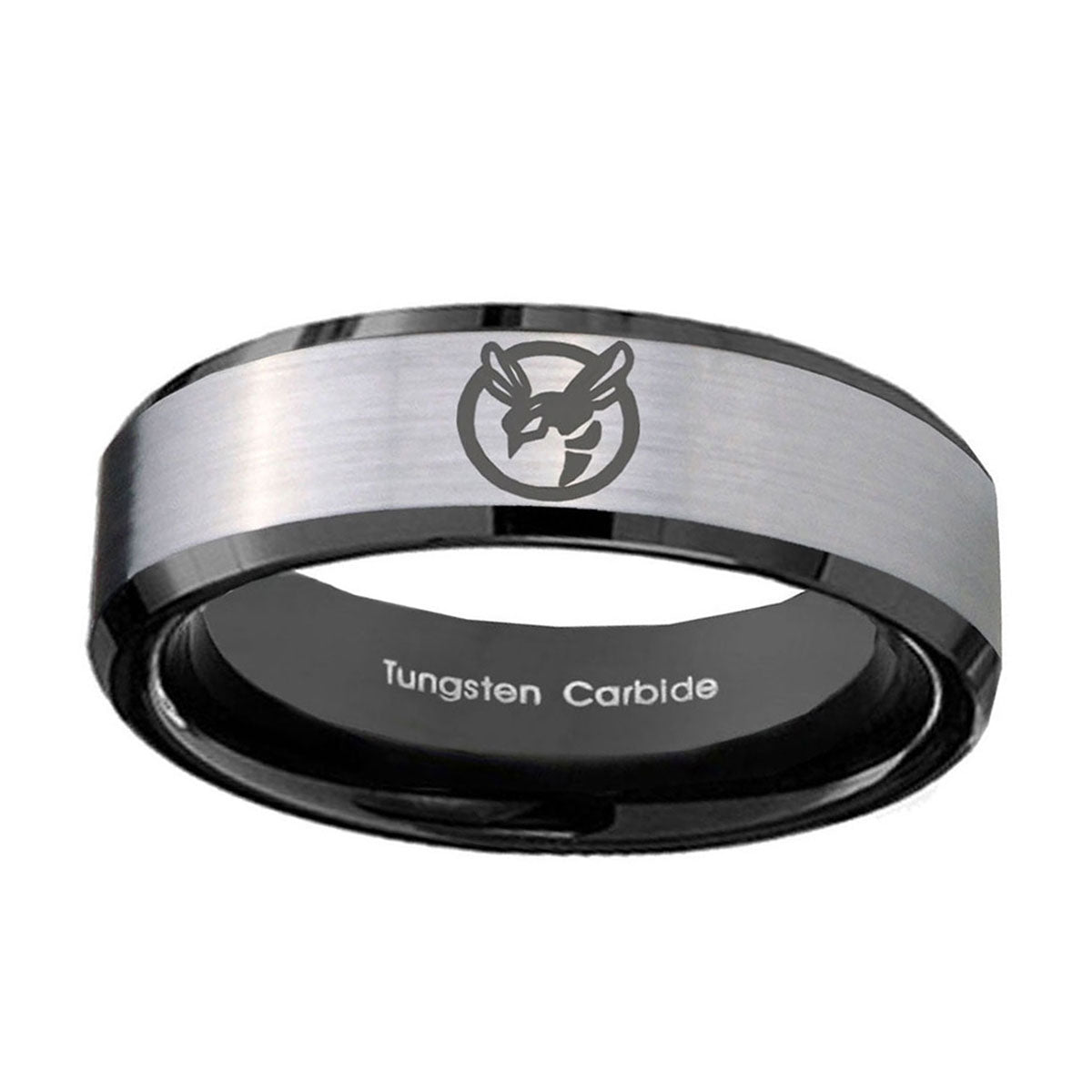 Personalize the 10mm Honey Bee Beveled Edges Brushed Silver Black Tungsten Personalized Ring. This silver and black tungsten ring with Honey Bee design is perfect for custom engravings.