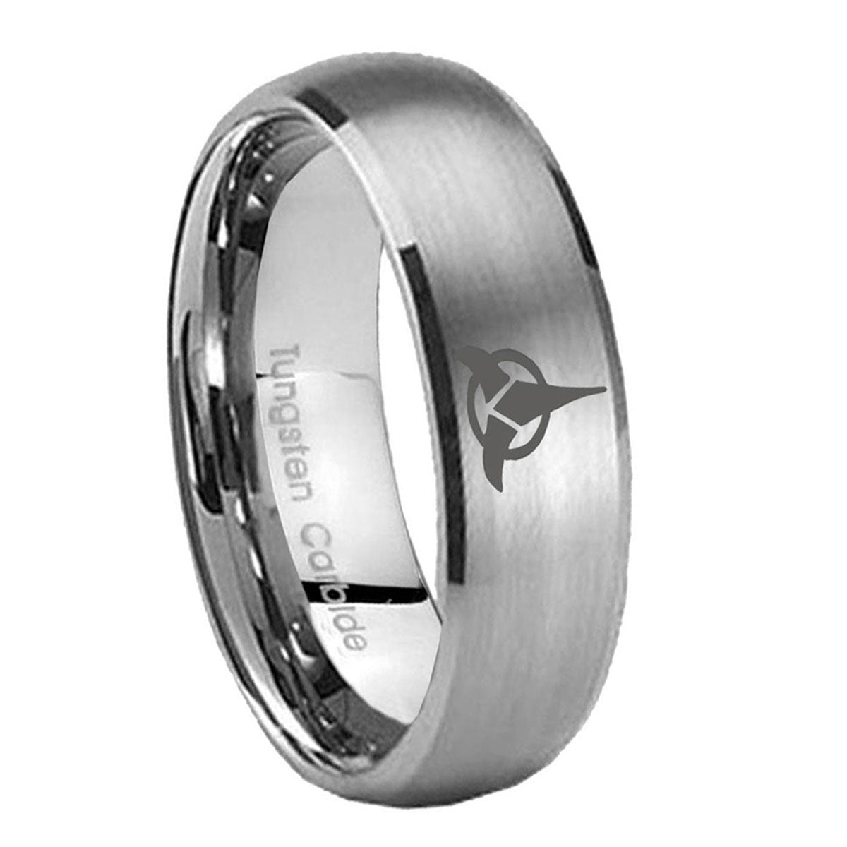Propose with the 10mm Klingon Dome Brushed Tungsten Carbide Mens Engagement Ring. This brushed tungsten dome ring with Klingon design is ideal for engagements.