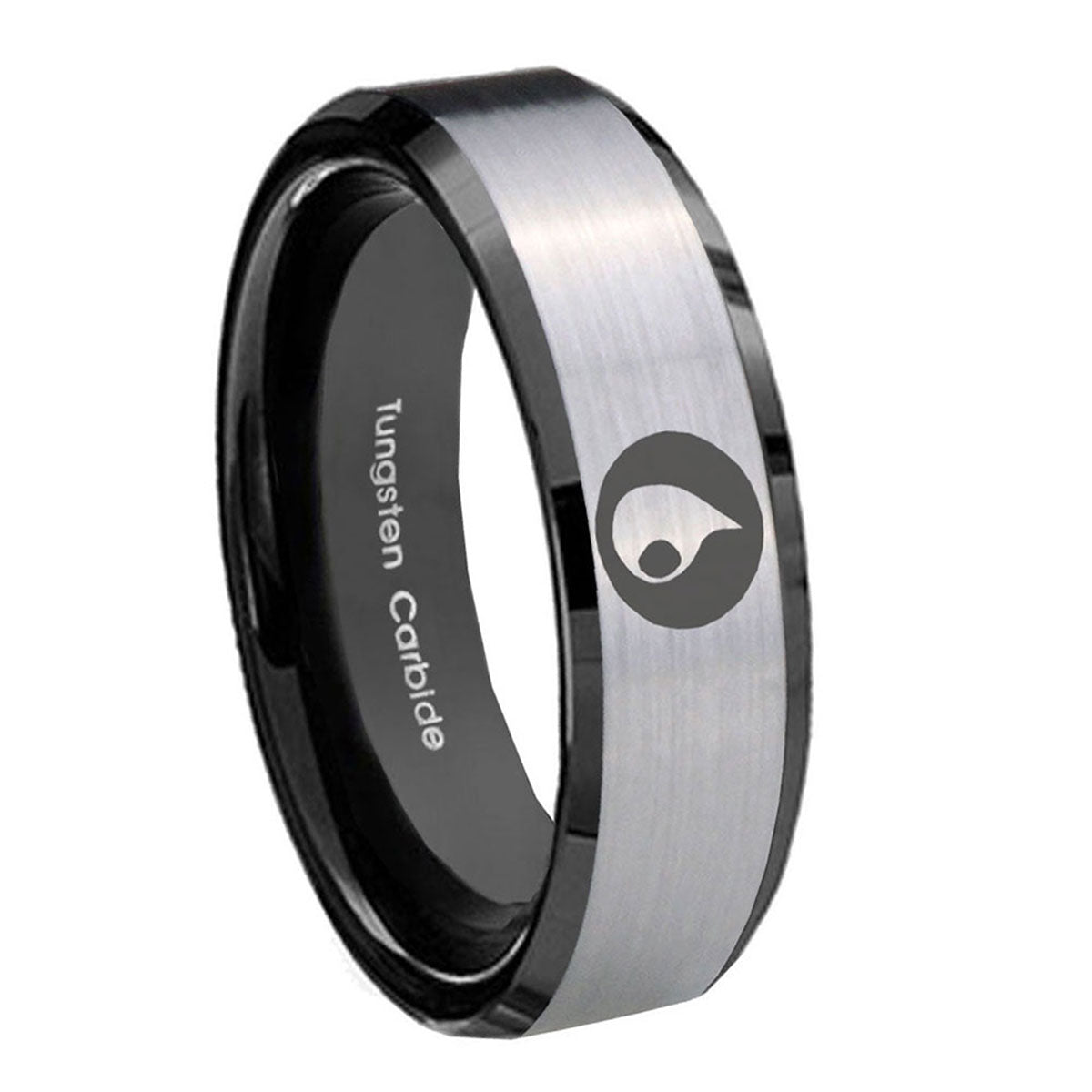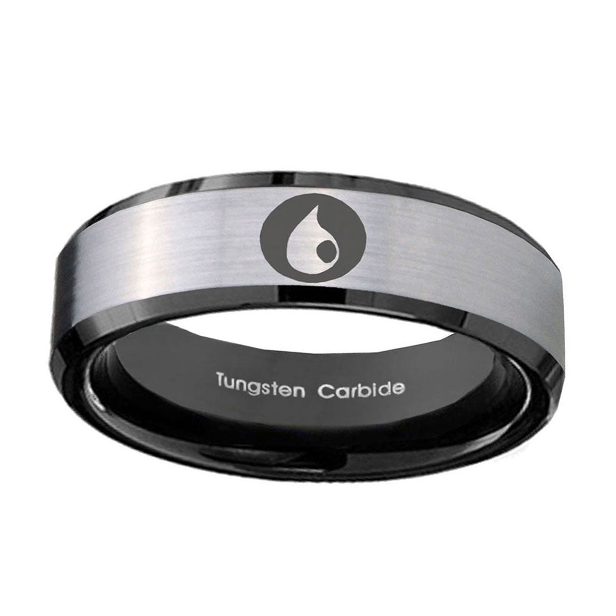 Propose with the 10mm Magic Gathering Beveled Brushed Silver Black Tungsten Mens Engagement Ring. This silver and black tungsten ring with Magic Gathering design is ideal for engagements.