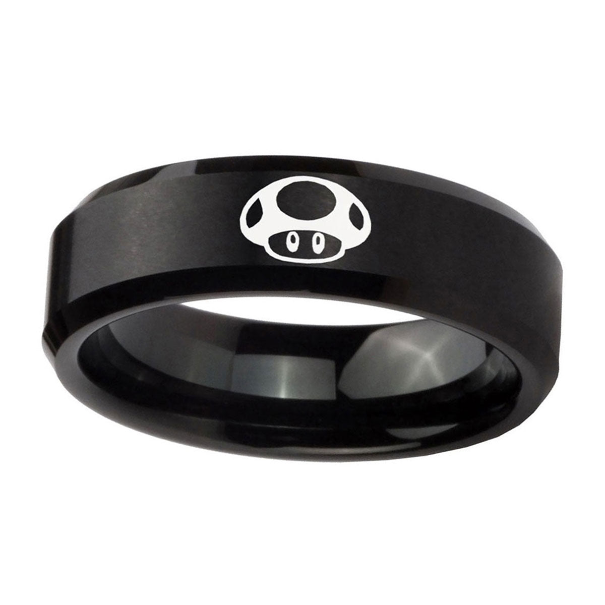 Customize the 10mm Mario Mushroom Beveled Edges Brush Black Tungsten Carbide Custom Mens Ring. This brushed black tungsten ring with Mario Mushroom design is perfect for personalization.